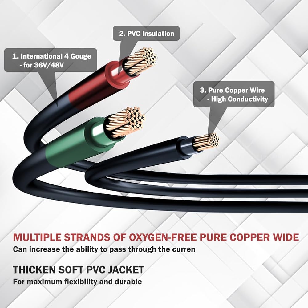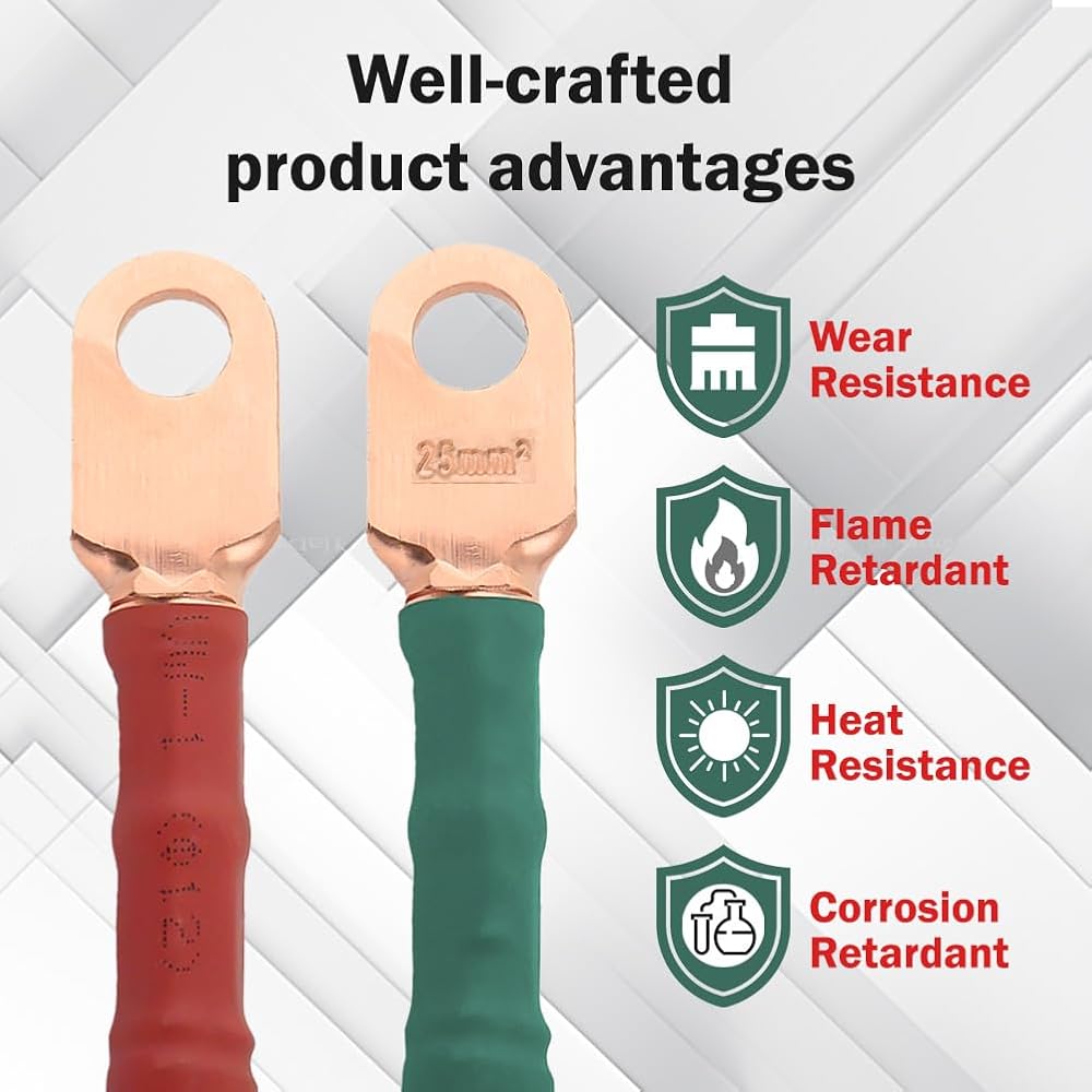 المواد: كابلات بطارية عربة الجولف مصنوعة بكابل Power-Flex فائق المرونة، وأنابيب انكماش حراري من البولي أوليفين مطبقة لتشكيل ختم واقي، وكابل نحاس نقي مجدول بنسبة 100% لتطبيقات التيار، 600 فولت، وعروات الكابلات النحاسية مغلفة بالقصدير وتستخدم تصميم نهاية مغلقة للحماية من التآكل.