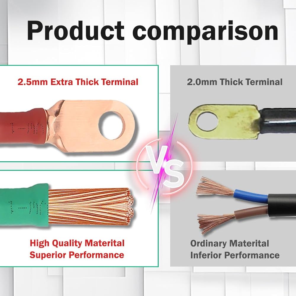 محتويات العبوة: 4 قطع من أسلاك كابلات البطارية مقاس 10 بوصة؛ وقطعة واحدة من أسلاك كابلات البطارية مقاس 13 بوصة. ضمان الرضا: إذا كانت هناك مشكلة مع المنتج، فسوف تحصل على بديل أو استرداد كامل المبلغ.