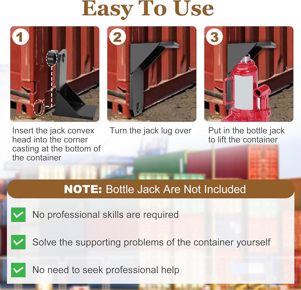 【Easy installation】How to use: Insert the shipping container booster lifter convex head into the corner casting at the bottom of the container, then turn over, and place the Jack bottle under the shipping container jack lug, you can easily lift the container. Please note: Jack bottles are not included.