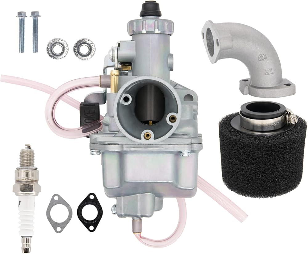 VM22 26mm Carburetor for Mikuni Intake Pipe Pit Dirt Bike 125cc 110cc 140cc Lifan YX Zongshen Pit Dirt Bike Application: Brand New Aftermarket VM22 Carburetor fits for XR50 CRF70 KLX BBR Apollo Thumpstar Braaap Atomic DHZ SSR. 26mm carburetor compatible with any 110 cc, 125 cc, 140 cc Lifan YX Zongshen Pit Dirt Bikes. Works on most 4-stroke quad and pit bike engines of 125cc and some 140cc. FUNCTIONS This Carburettor is ideal bolt on upgrade for increased power and performance. Quality built product with durable performance direct fit to original equipment. Installing this pit bike carburetor on an xMoto 125 2020 model it worked perfect lots more power than factory carburetor. Installing this 125cc dirt bike carburetor on a Pitster Pro FSE110R. For the Apollo bike, vm22 carburetor is a bolt on, easy swap for the original carb. Installed 110cc carburetor on your bike it runs and drives flawless now very responsive with nice low tone idle! SPECIFICATION Material :Zinc alloy Manifold Outlet Diameter: 26mm (22mm inner) Manifold Bolt Eye-Eye: 48mm Manifold Bolt Diameter: 6.5mm Outlet Diameter: 38mm Package Included: 1x vm22 26mm carburetor; 1x Air Filter W/ 1 C-clip; 1x Inlet Pipe W/ Mounting 2 Bolts, 2 Gaskets, 1 Washer; 1x Spark Plug. Note: 1. This is an Aftermarket replacement vm22 carb Not OEM. 2.Please clean up the oil channels as well as use the clean fuel before installing the vm22 carburetor kit. 3. Please compare your carburetor with the pictures and make sure this 26mm carburetor kit fits your motorcycle before you purchase.
