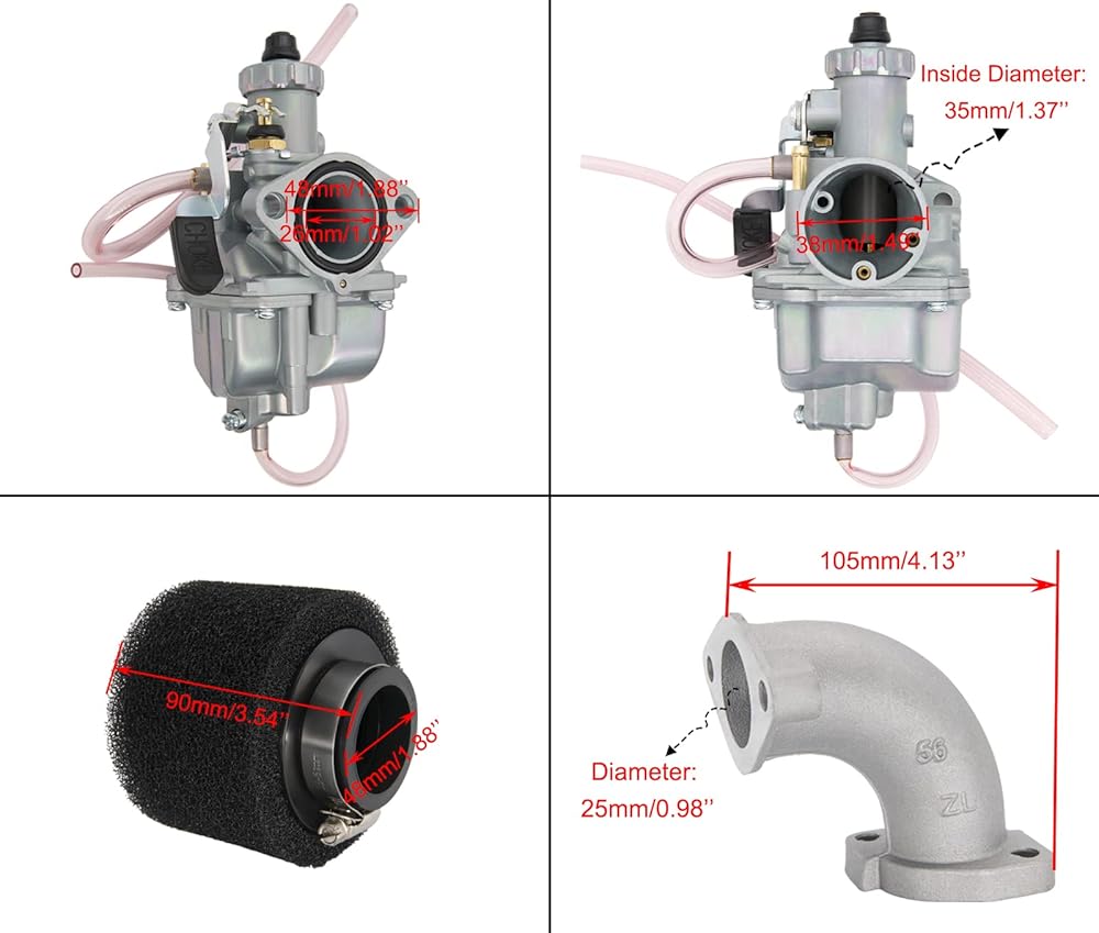 Specification - 1 x vm22 carburetor kit, you will get all parts shown in the pictures. Engine side - Manifold Bolt Eye-Eye: 48mm, Manifold Outlet Diameter: 26mm (22mm inner), Manifold Bolt Diameter: 6.5mm, Air Filter Outlet Diameter: 38mm. Please allow our pit bike carb data to have a slight manual measurement deviation