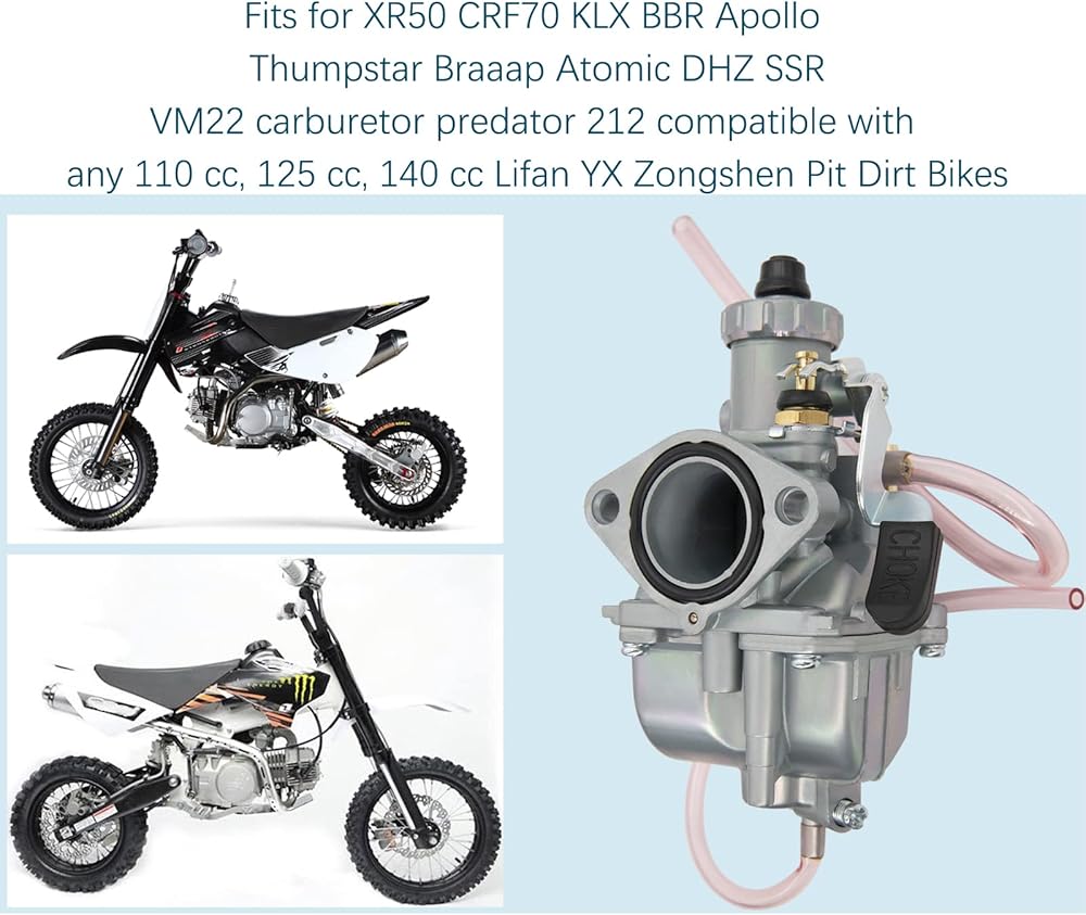 Compatibility - Brand New Aftermarket VM22 Carburetor fits for XR50 CRF70 KLX BBR Apollo Thumpstar Braaap Atomic DHZ SSR. Pit bike carburetor adapter compatible with any 110 cc, 125 cc, 140 cc Lifan YX Zongshen Pit Dirt Bikes. Please compare your carburetor with the pictures and make sure this 26mm carburetor kit fits your motorcycle before you purchase