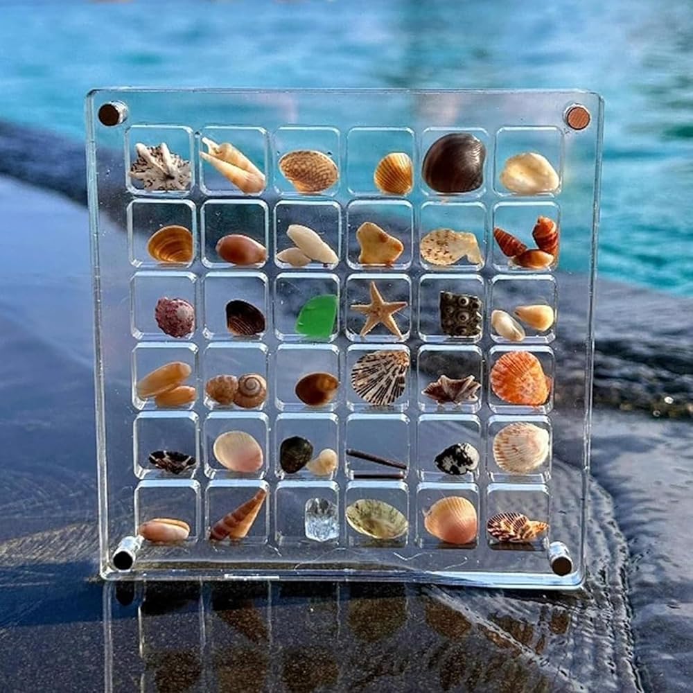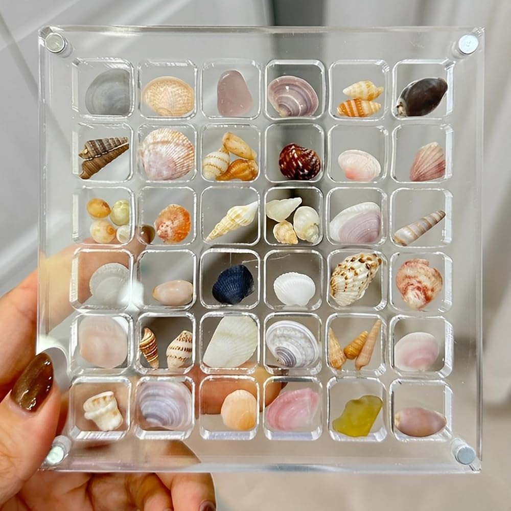 صندوق عرض صدف مغناطيسي من الأكريليك، صندوق تخزين صدف مزخرف من الأكريليك، حافظات عرض صخرية قابلة للتكديس، رف عرض نجم البحر، صندوق منظم للتخزين للصدف والخرز والمجوهرات (36 شبكة)