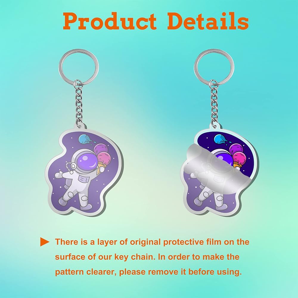 سلسلة المفاتيح الرائعة مصنوعة من مواد أكريليك متينة عالية الجودة. توجد طبقة من الفيلم الواقي الأصلي على سطح سلسلة المفاتيح الخاصة بنا. من أجل جعل النمط أكثر وضوحًا، يرجى إزالته قبل الاستخدام.