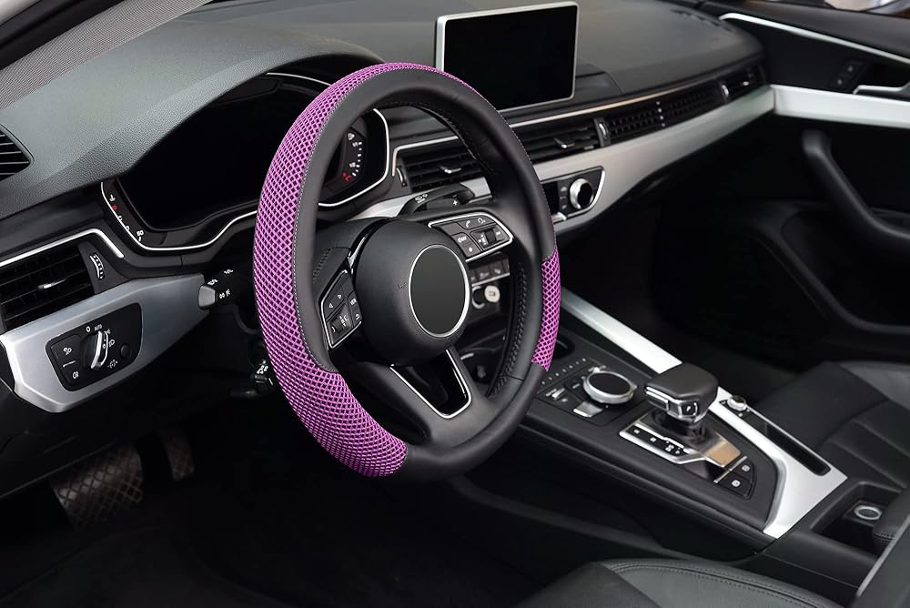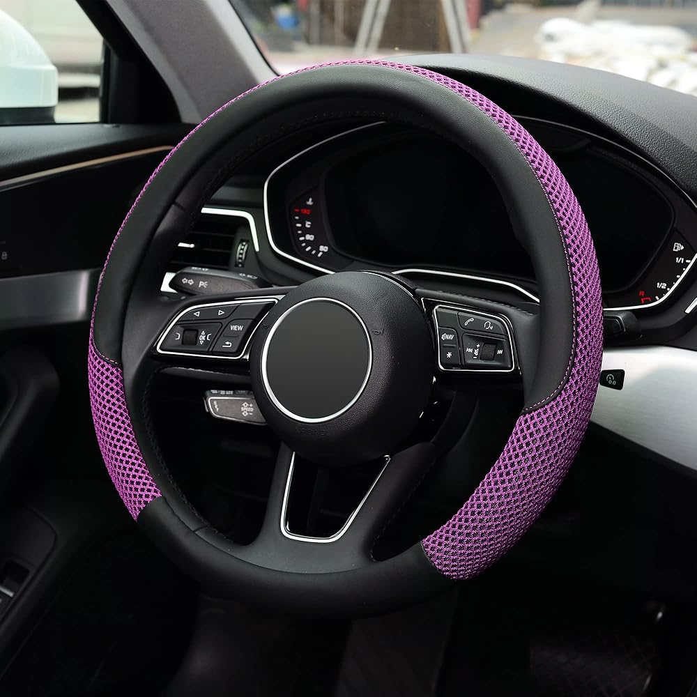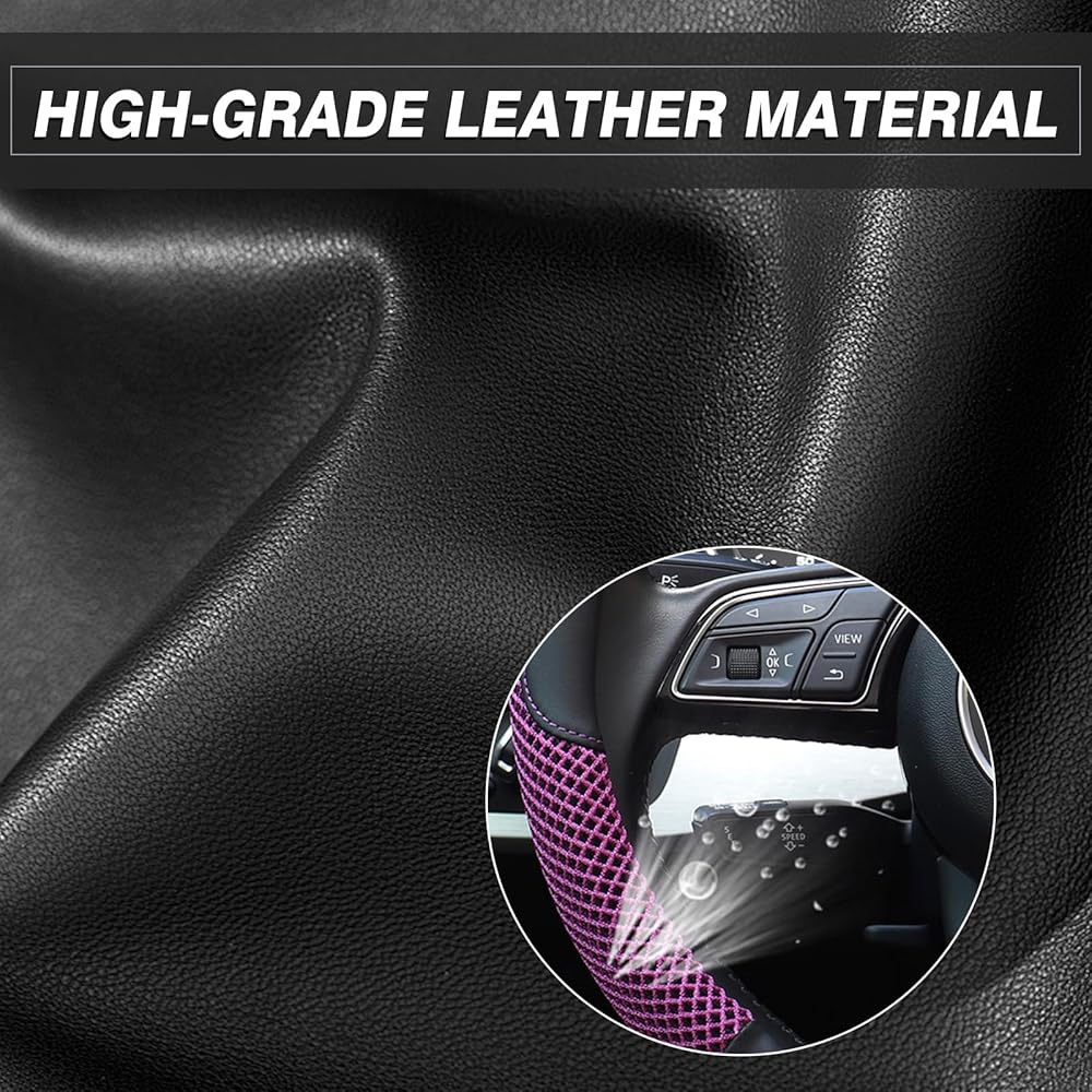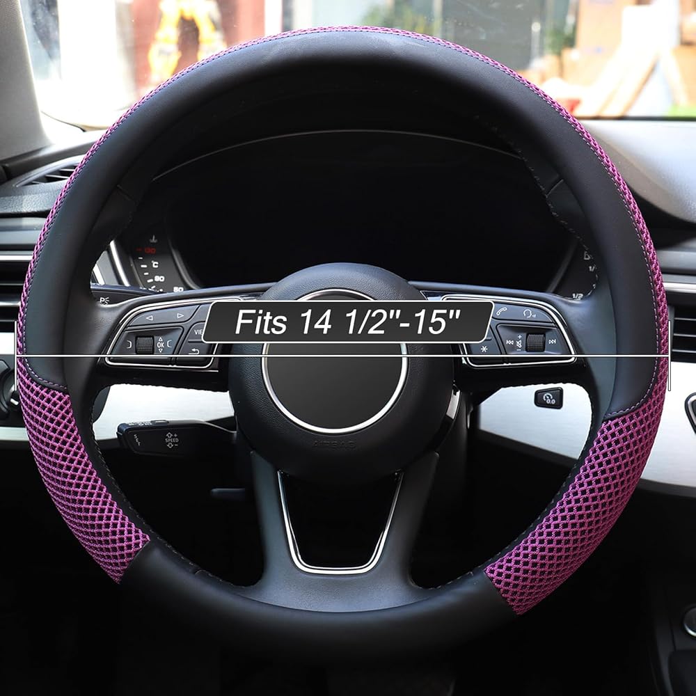 غطاء عجلة القيادة KAFEEK، عالمي 15 بوصة، جلد فسكوز من الألياف الدقيقة، مسامي، مضاد للانزلاق، دافئ في الشتاء وبارد في الصيف، أسود وبنفسجي