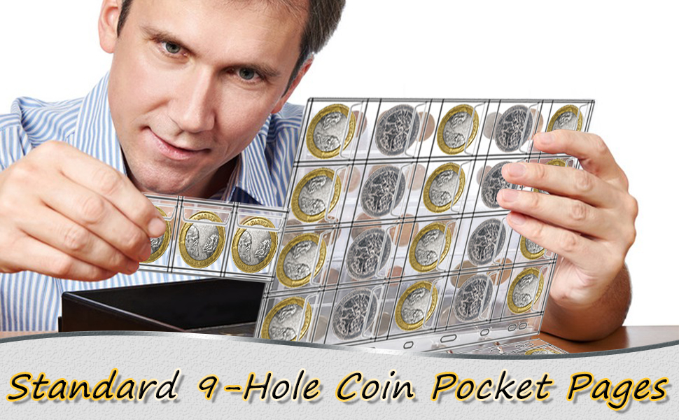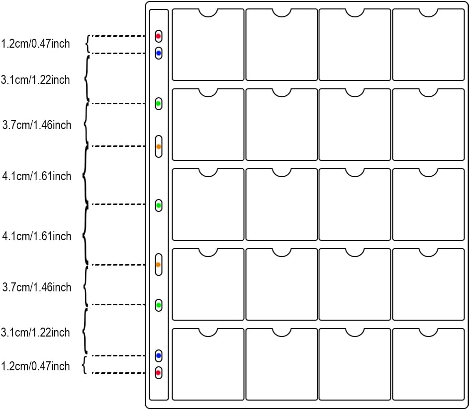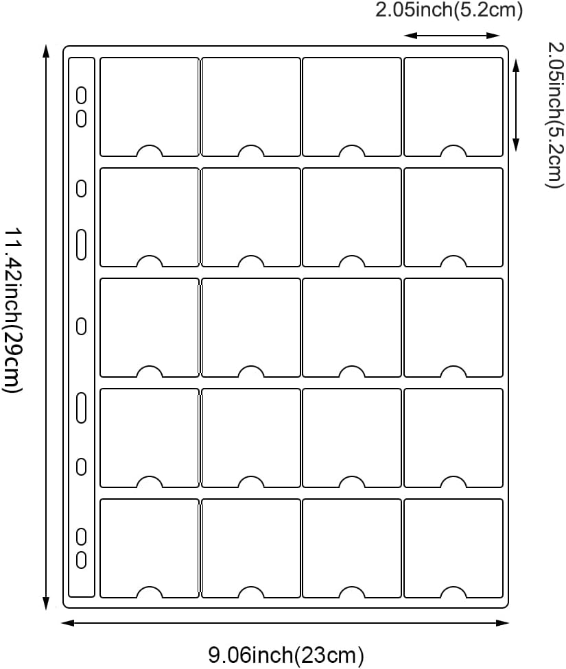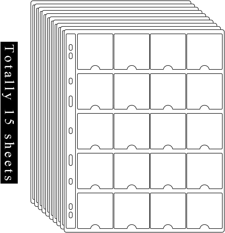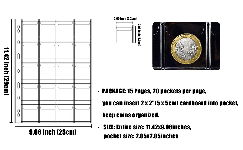 العبوة: 15 صفحة، 20 جيبًا في كل صفحة، يمكنك إدخال 2 × 2 بوصة (5 × 5 سم) من الورق المقوى في الجيب، والحفاظ على العملات المعدنية منظمة.