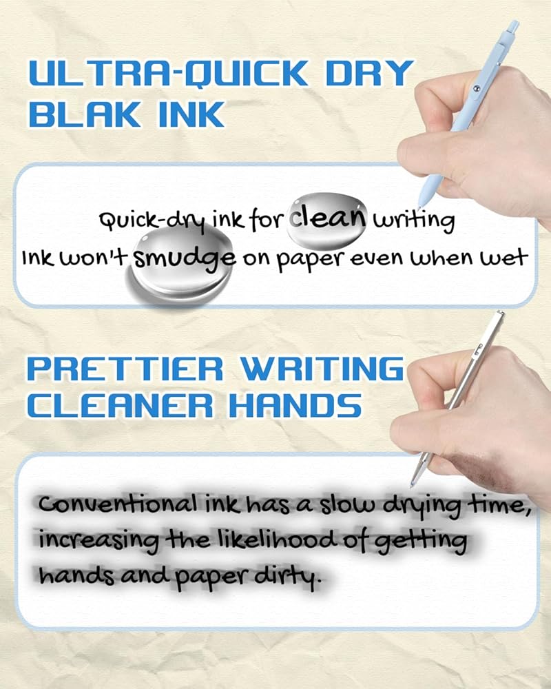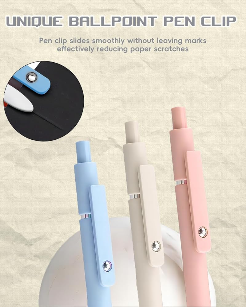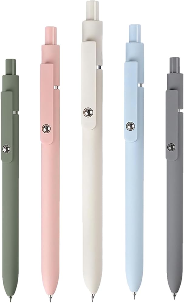 أناقة قابلة للسحب: استمتع بالأناقة بنقرة واحدة باستخدام أقلامنا القابلة للسحب. التصميم الأنيق وقبضة السيليكون الناعمة تجعل هذه الأقلام مثالية للاستخدام اليومي. سواء كنت طالبًا أو محترفًا، فإن هذه الأقلام الجمالية تضيف لمسة من الأناقة إلى لوازم عملك أو مدرستك
