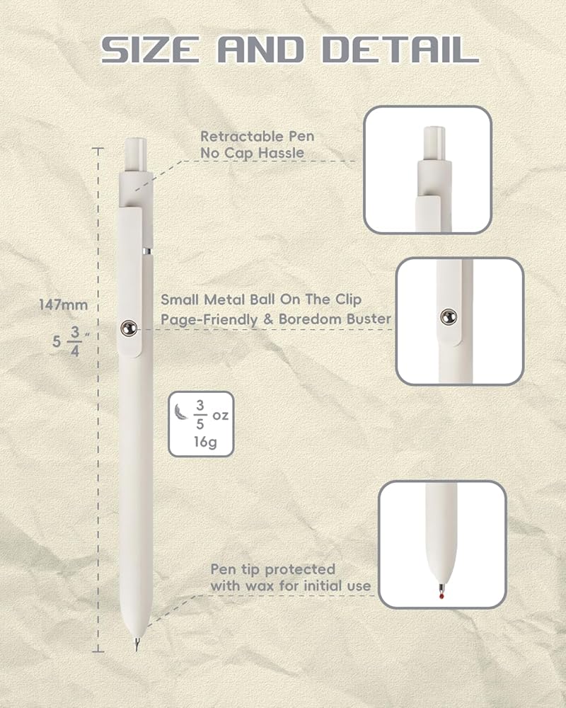 شعور ممتاز بالكتابة: مجموعتنا المكونة من 6 أقلام هلامية ليست مخصصة للكتابة فحسب، بل هي عبارة عن أسلوب جمالي. محكمة الغلق بالشمع قبل الاستخدام الأول لمنع تسرب الحبر، وتوفر توزيعًا متوازنًا للوزن من أجل شعور ممتاز بالكتابة.