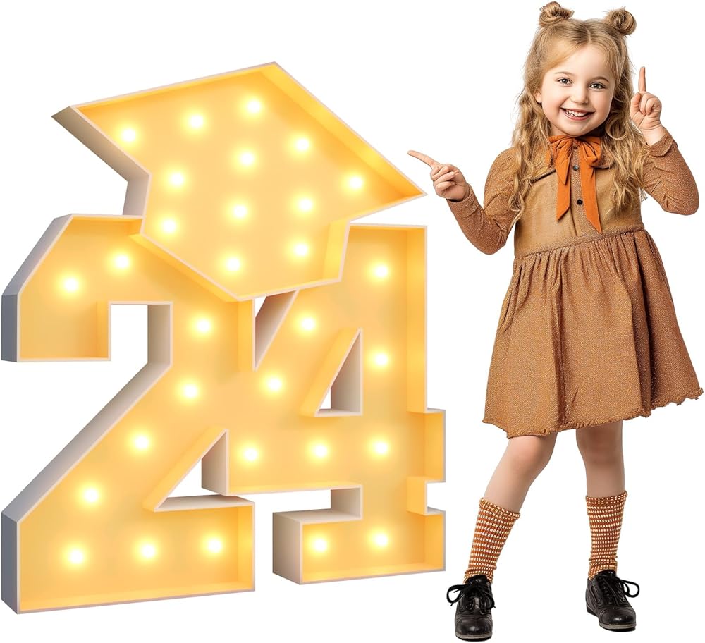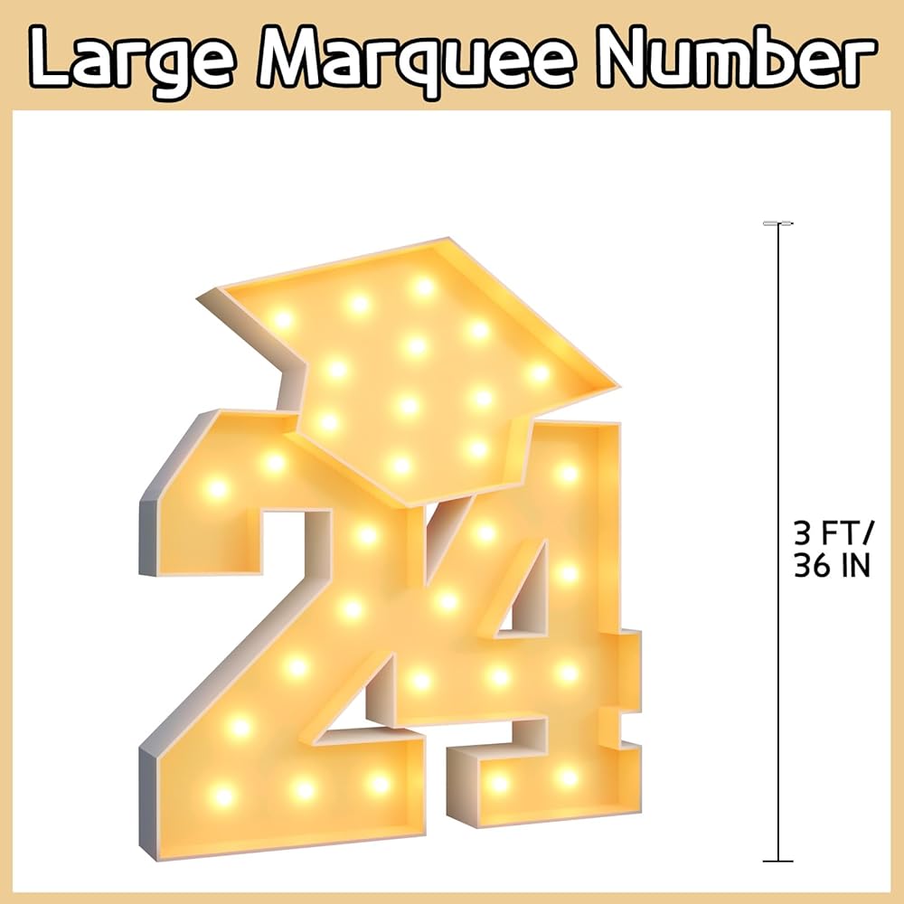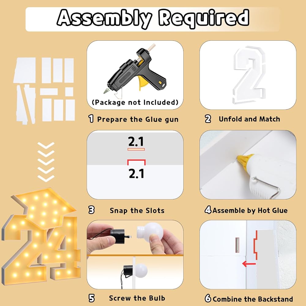 【Easy to Assemble】36'' Large Marquee number 24 is pre-cut frame with slots, 1) Match the slots on the board and reinforce each connection by hot glue. 2) Snap the bulbs on the board and install 3 AA batteries. (Noted: Glue gun and batteries are not included)