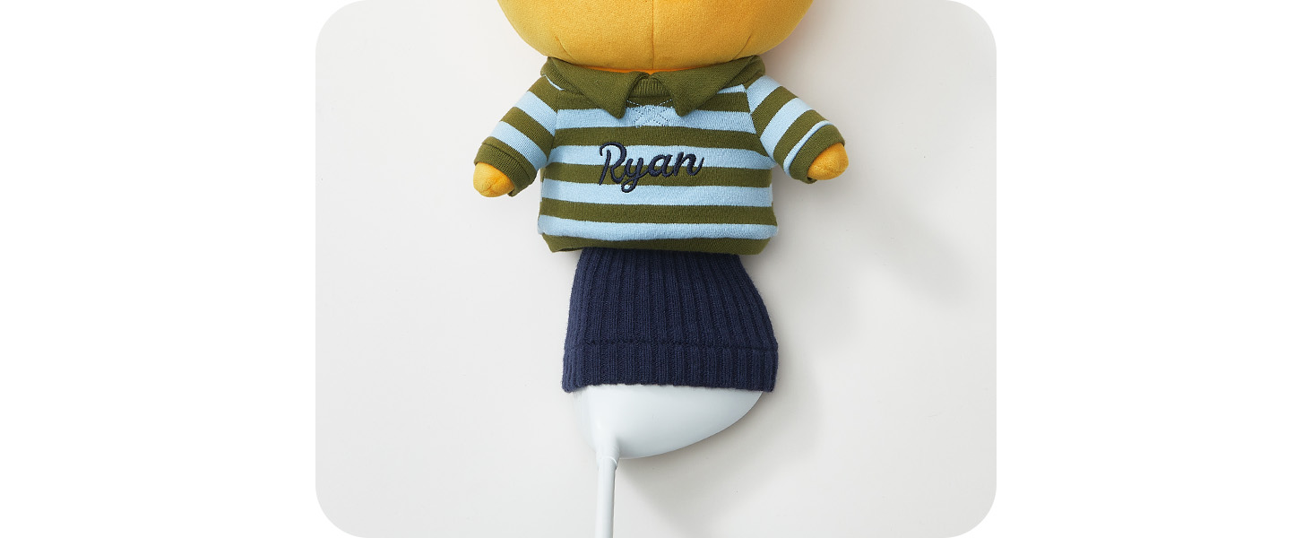 OFFICIAL KAKAO FRIENDS GOLF HEADCOVER: Ryan wearing a stripe polo sweater will be cheering you on the field. Ryan's clothes embroidered with his name add extra sophistication to the unique design.