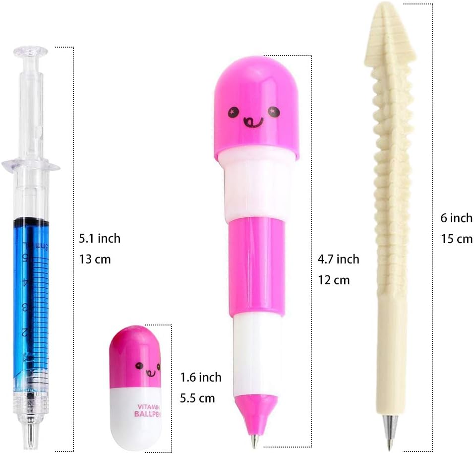 - Package Contents: Includes 4 syringe pens, 10 bone-shaped ballpoint pens, and 6 smiling face pill-shaped ballpoint pens