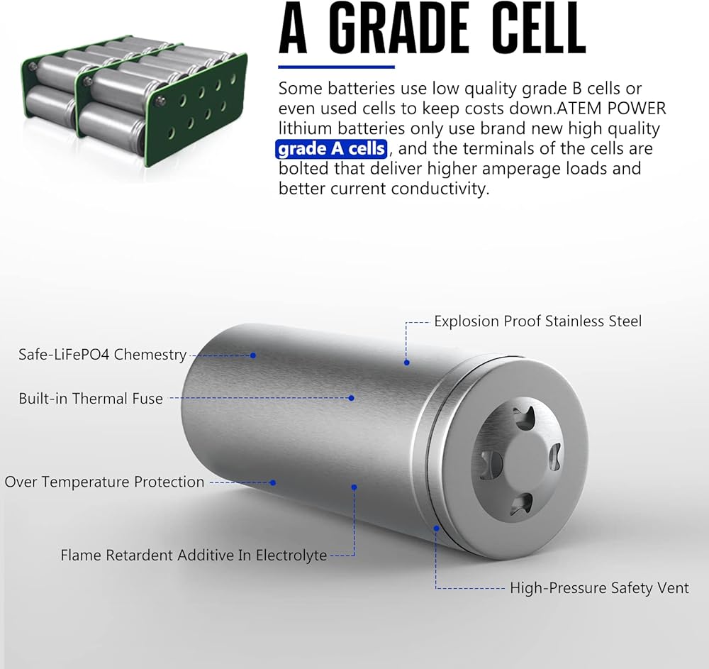 خلية من الدرجة A: بالمقارنة مع بطاريات LiFePO4 الأخرى دون المستوى القياسي، تتكون حزمة بطارية الليثيوم أيون هذه من خلايا من الدرجة A، ويتم تثبيت أطراف الخلايا الخاصة ببطارية فوسفات الحديد الليثيوم هذه لتوفير أحمال تيار أعلى وتوصيل تيار أفضل. تسمح المقاومة الداخلية المنخفضة لبطارية الليثيوم ذات الدورة العميقة بقبول الشحن بشكل أسرع، مما يجعل بطارية LiFePO4 جاهزة للاستخدام بشكل أسرع بكثير.