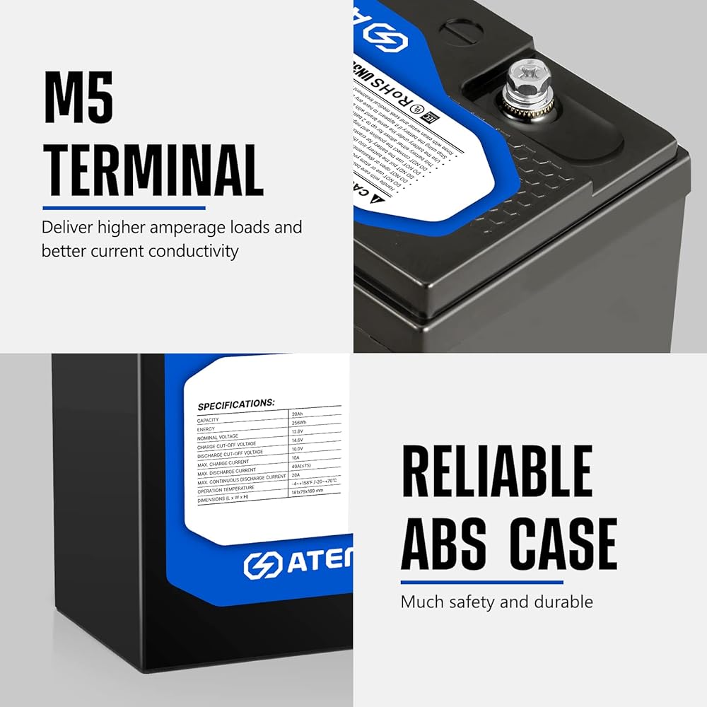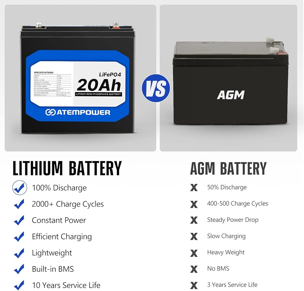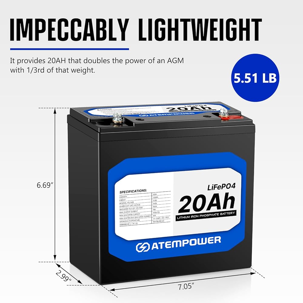 آمنة وخفيفة الوزن تمامًا: استخدم بطارية LiFePO4 هذه إذا كنت تريد تقليل المخاوف بشأن وزن وسلامة حزمة بطارية الليثيوم أيون! توفر بطارية LiFePO4 هذه 20AH مما يضاعف قوة AGM بثلث هذا الوزن. وبطارية ليثيوم فوسفات الحديد هذه تقضي على خطر الانفجار.