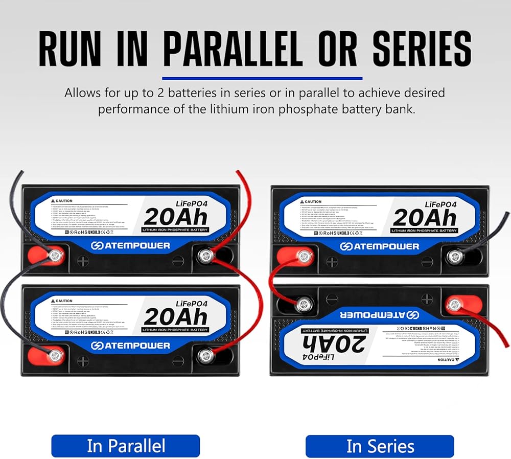 التشغيل بالتوازي أو السلسلة: نظرًا للجهد والسعة المحدودين لحزمة بطارية أيون الليثيوم المفردة، هناك حاجة إلى التوصيل المتسلسل والمتوازي لبطارية الليثيوم ذات الدورة العميقة في الاستخدام الفعلي لبطارية LiFePO4 للحصول على جهد وقدرة أعلى. تسمح بطارية LiFePO4 هذه بما يصل إلى بطاريتين متتاليتين أو بالتوازي لتحقيق الأداء المطلوب لبنك بطاريات فوسفات الحديد الليثيوم.