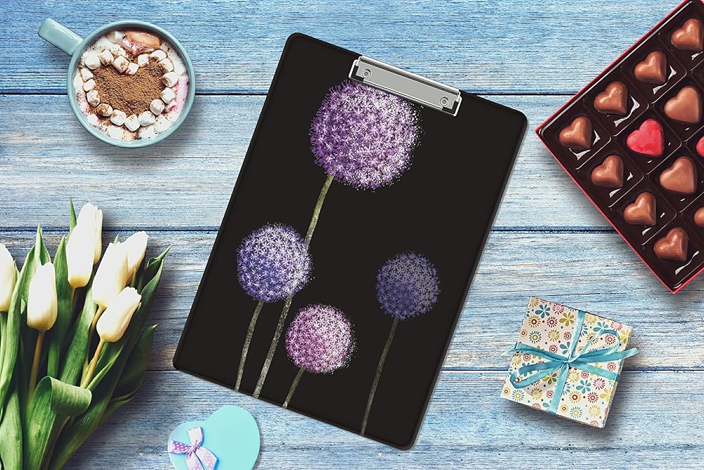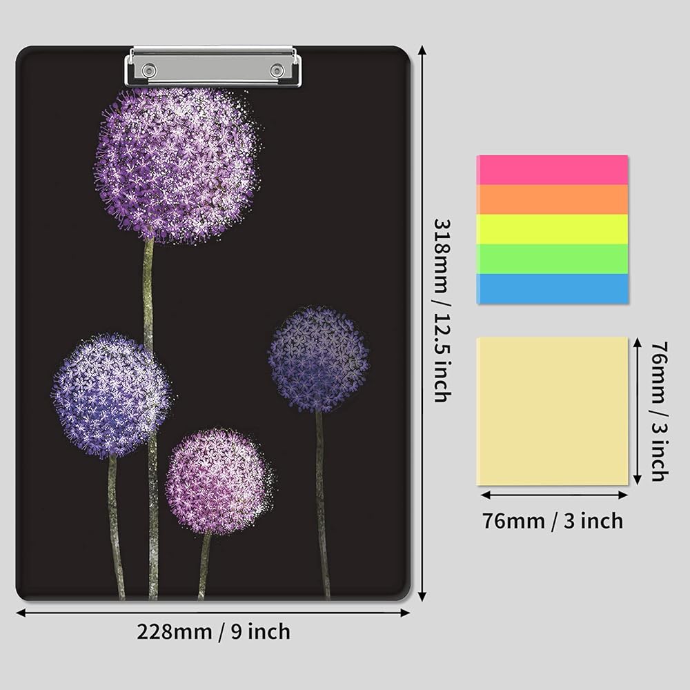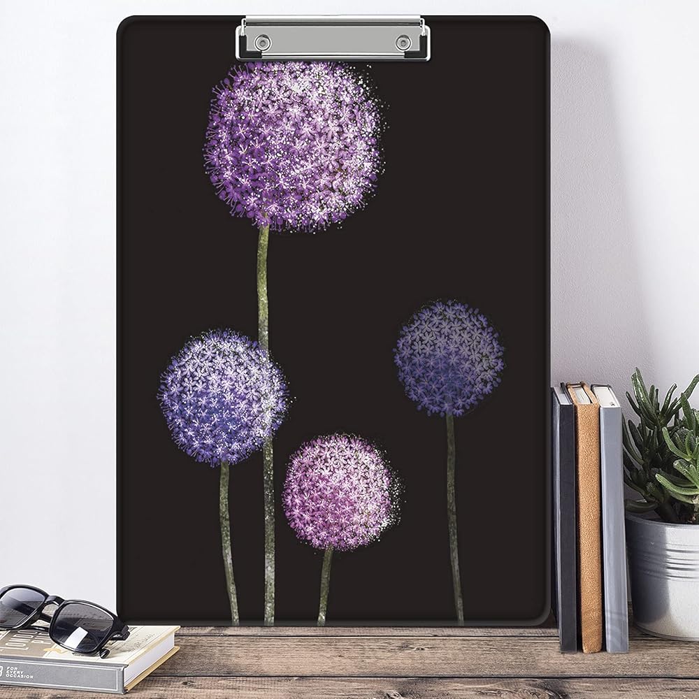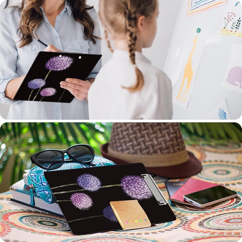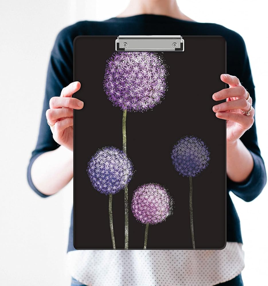 حافظة بلاستيكية مزخرفة مقاس 9 × 12.5 بوصة، لوحات كتابة لطيفة بحجم حرف A4 للممرضات والطلاب والنساء والمكاتب، مشبك منخفض المستوى مع فتحة تعليق قابلة للسحب - الهندباء المائية الأرجوانية