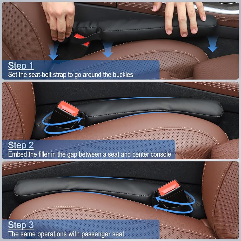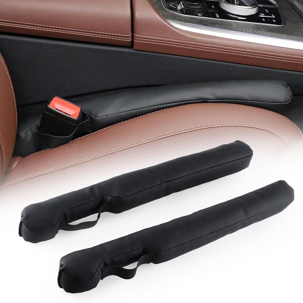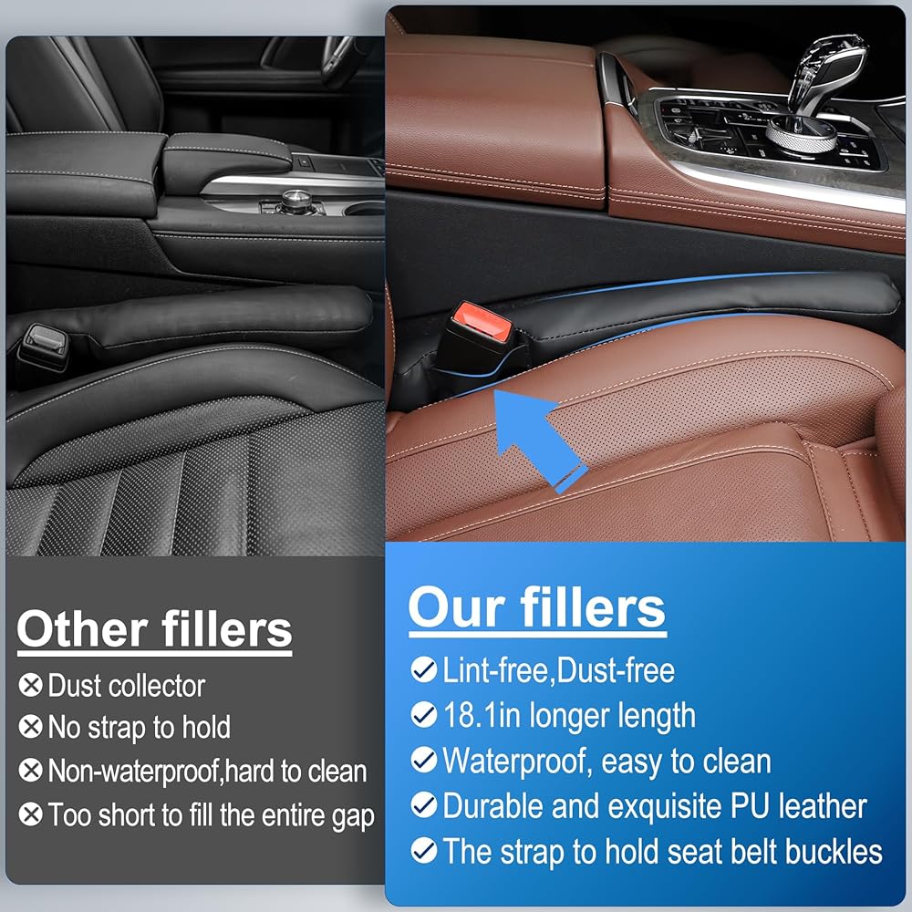 Longer Lengh & Exquisite PU leather:18inch longer lengh seat gap filler is enough to fill the entire gap and fit around the seatbelt holder well; made of soft and flexible pu leather material, which will not damage your car's interior. scratch-proof, water proof, easy to clean.
