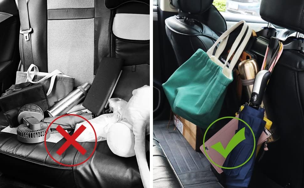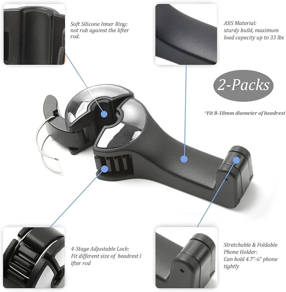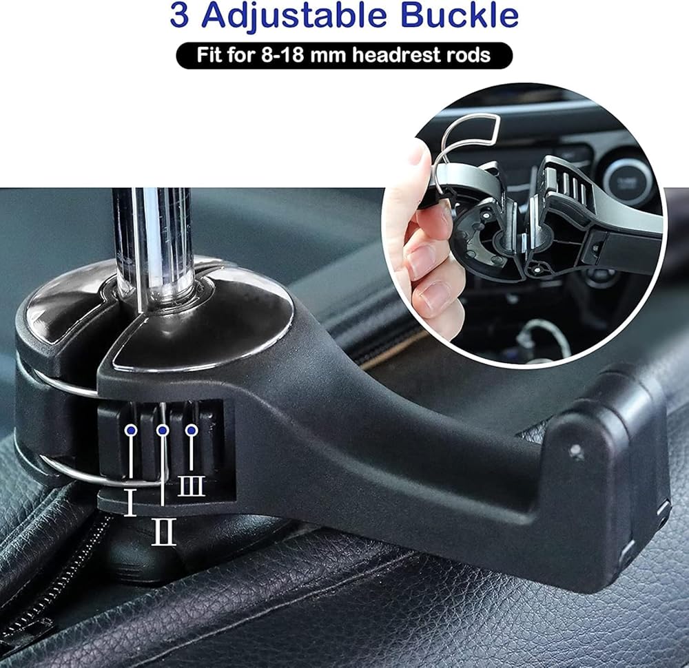 【2 In 1 Car Headrest Hidden Hook】Rear hook for car seats with cell phone holder not only as a holder for your purse or grocery bags but also as a mount for your cell phone which can hold the phone firmly ,your children or friends can enjoy the movie in the back seat. By the way, car multifunctional headrest hook suitable for the phone with a width of 1.9-3.5 inches. 【Universal car seat hooks ,fit for All Vehicles 】The car seat rear hook will not scratch the headrest pole; the smooth serrated hood can prevent the car hooks from loosening. Hook to an adjustable 4-stage lock, you can adjust the tightness according to the model, which makes it universal for all models. 【360° Rotation, Hidden car hook】Adjustable car seat headrest hook can be rotated 360 degrees horizontally after installation. By rotating, the car hooks can be used in the front seat or backseat, and the locking feature keeps it securely in place. 【Easy to Install】Headrest hooks for car easy to install. No need adhesives or tools. No need dis-assemble the headrest. It's also easy to remove when not in need or changing to another car. 【Space Saving & Tiding ,Car Hooks for Purses and Bags】Magic car head rest hanger is great for hanging a shopping bag, grocery bags, a hat, your gloves, purse, umbrella, wallet , kids bags, kids car headphones, trash container...Very useful car hooks for back seat. Keeping your love car tidy and comfortable.