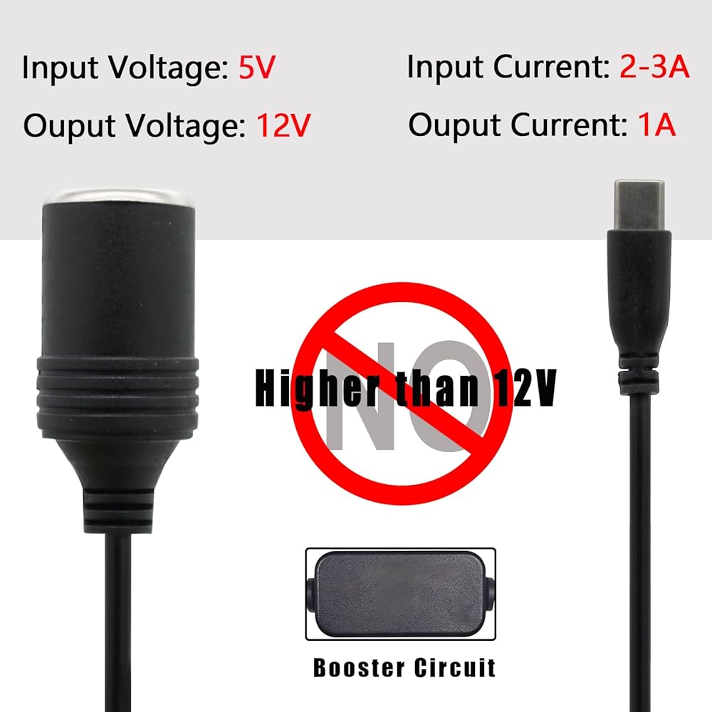 • مصدر الطاقة: 5 فولت USB A إلى 12 فولت مقبس ولاعة السجائر في السيارة، جهد الخرج: 12 فولت، تيار الإخراج: 1 أمبير (كحد أقصى)، ولكنه لا يدعم بعض الطاقة أعلى من الأجهزة الكهربائية 12 فولت.