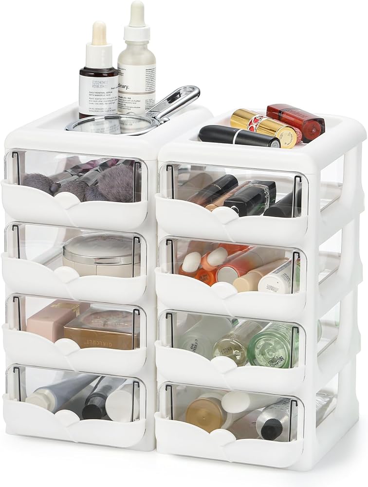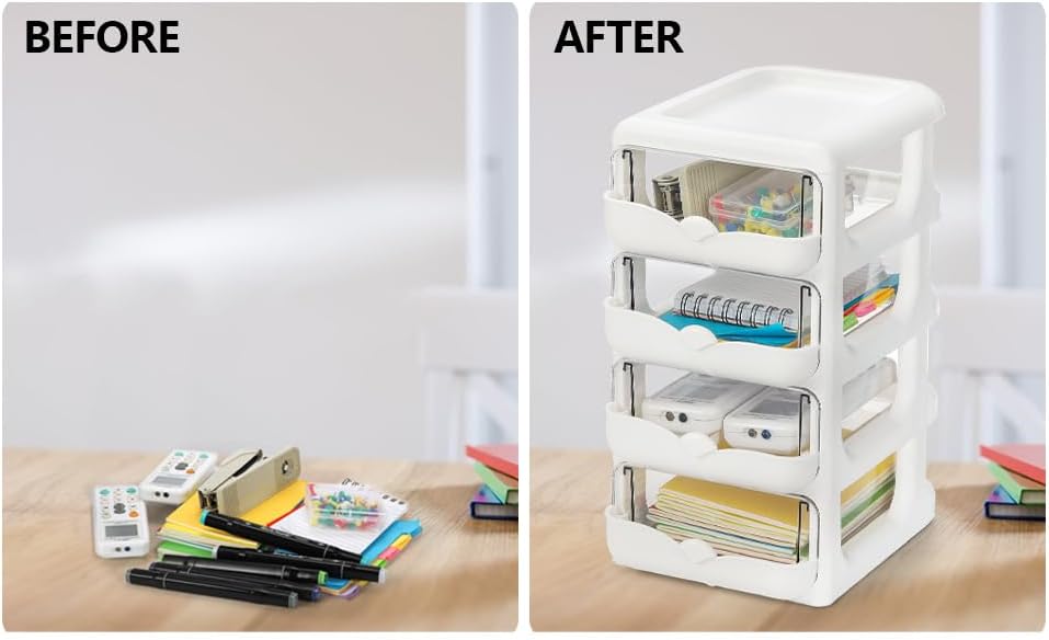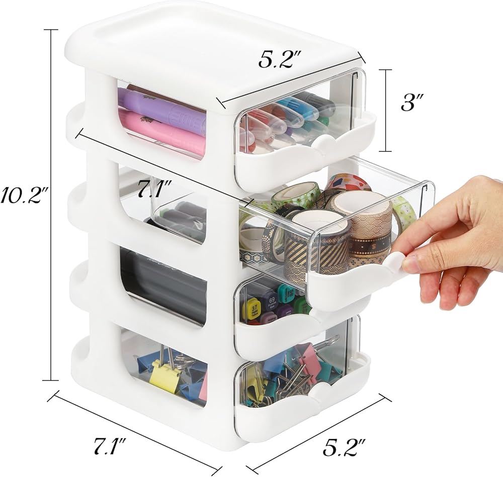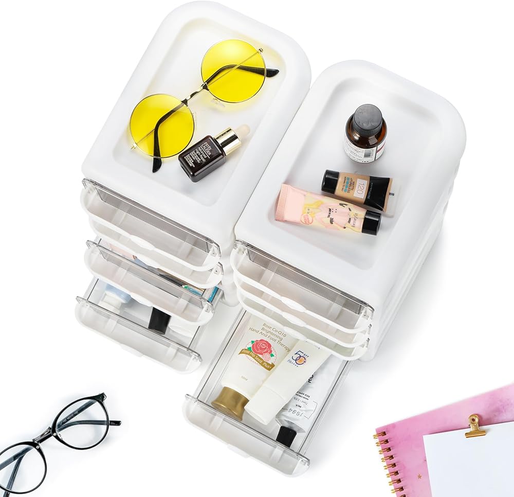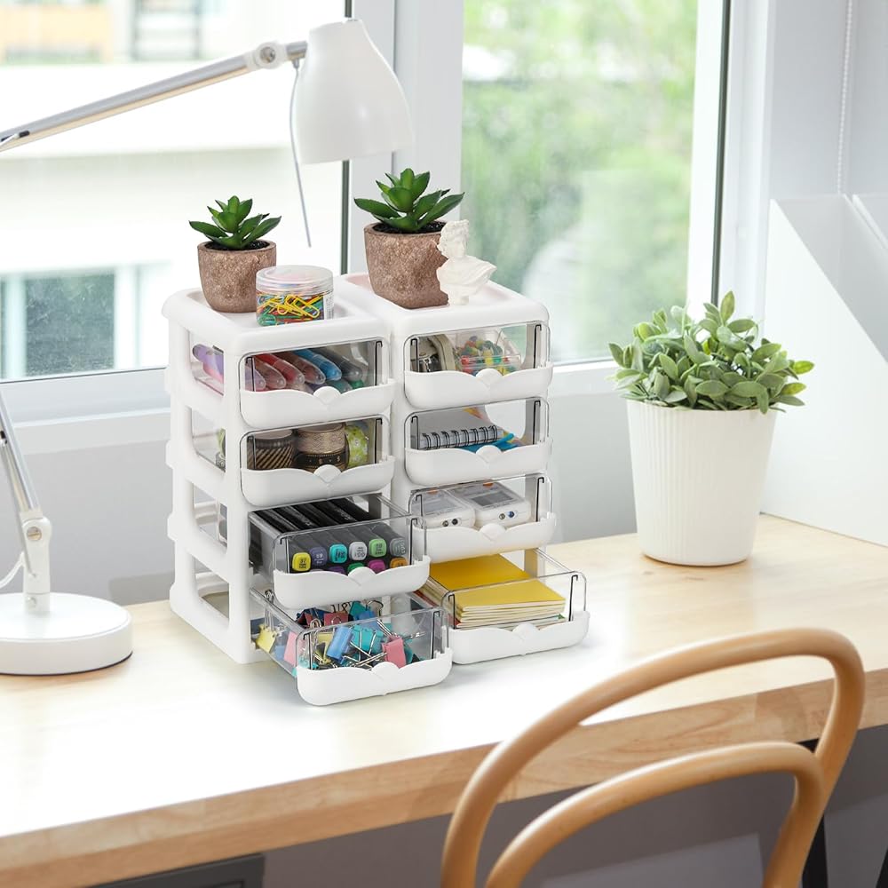 عبوتان من منظمات المكتب مع أدراج، وحدة تخزين مكتبية شفافة ذات 4 أدراج، علبة حاوية تخزين بلاستيكية، إطار أبيض مع أدراج شفافة للمكتب والمدرسة والحرف اليدوية