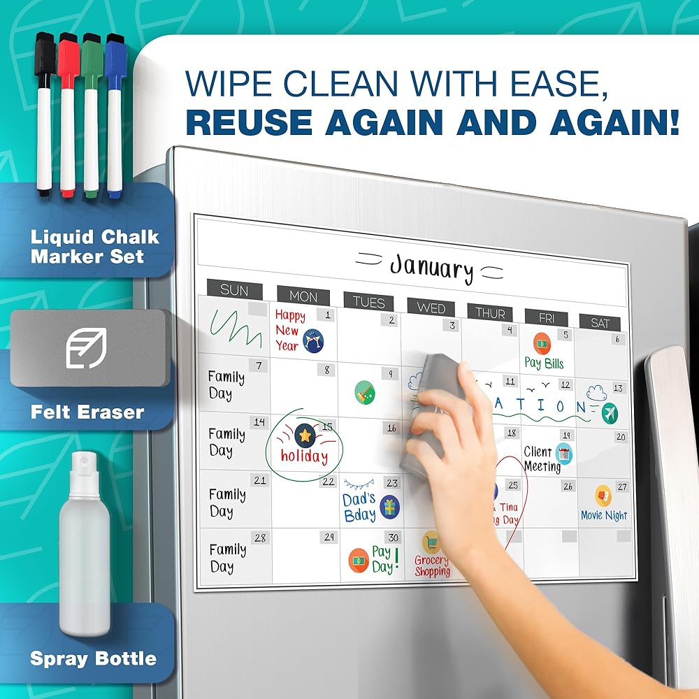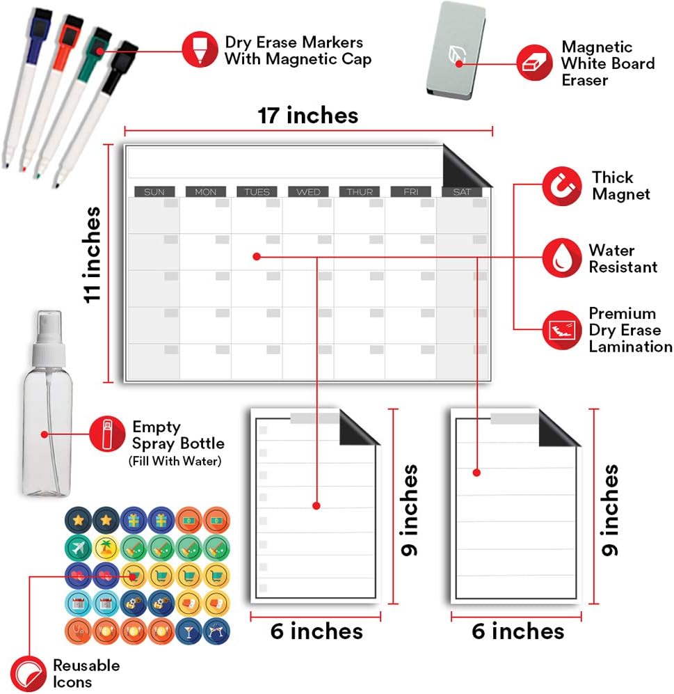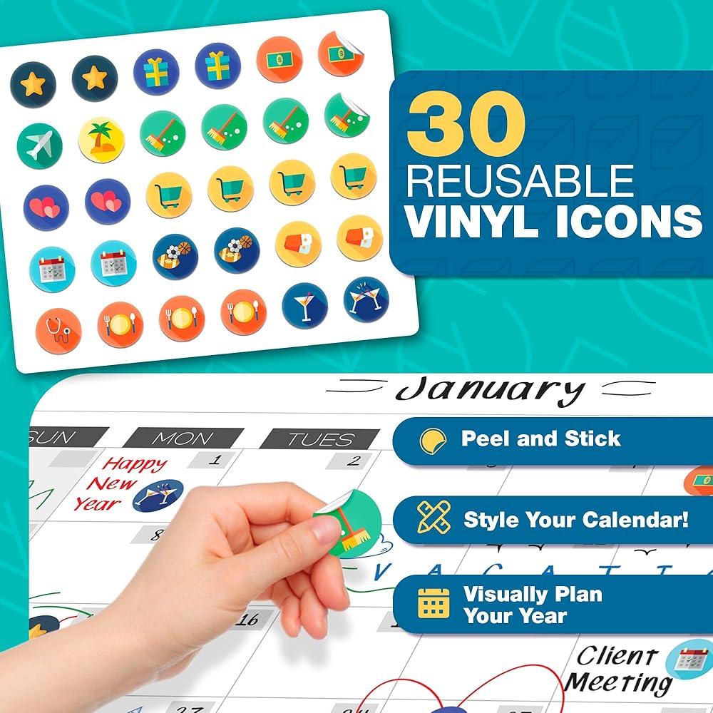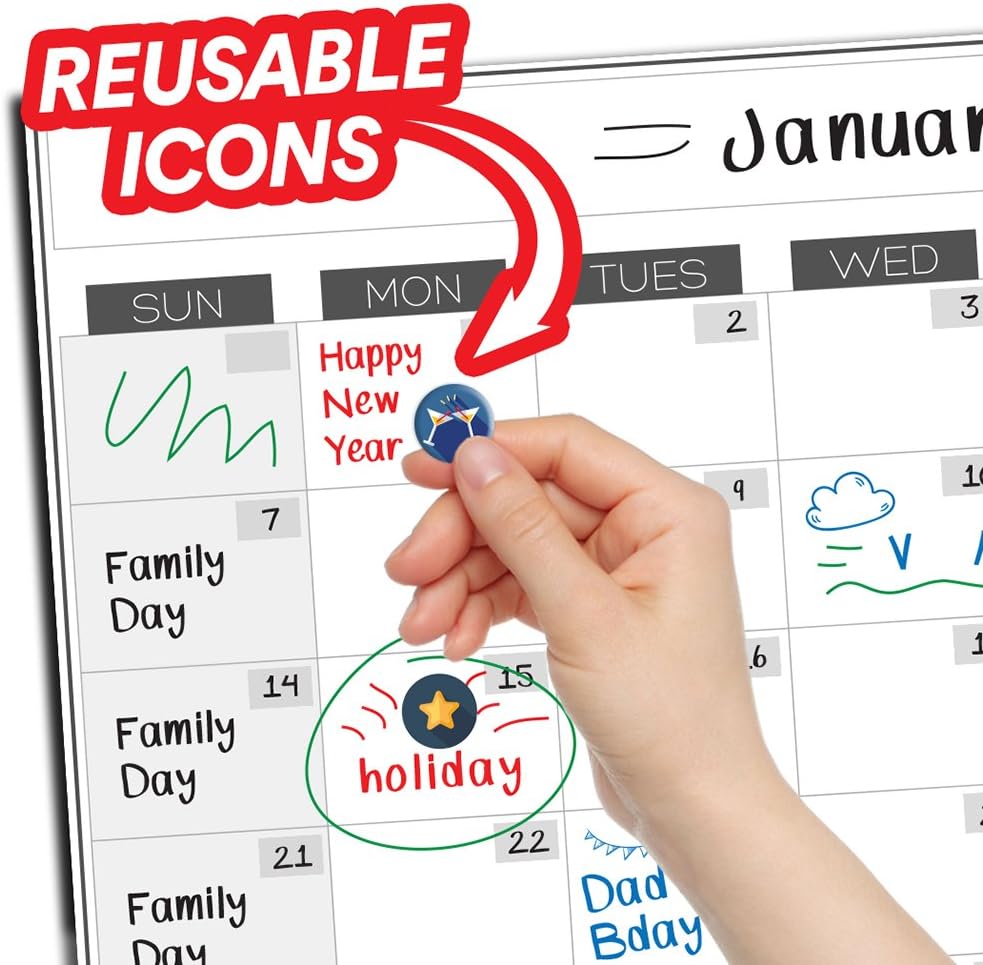 متجر واحد - تتضمن مجموعة التقويم الخاصة بنا (4) أقلام تحديد وأيقونات قابلة لإعادة الاستخدام وممحاة وزجاجة رش. في حين أن التقويمات الأخرى تلطخ بسهولة و/أو تتمزق و/أو تصل تالفة. التقويم الخاص بنا مغطى بطبقة رقيقة سميكة وجافة ويتم شحنه بشكل صحيح في صندوق الحماية الخاص به.