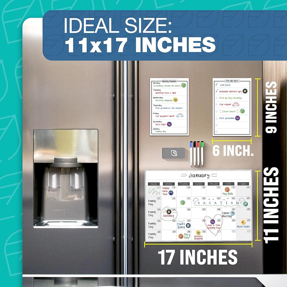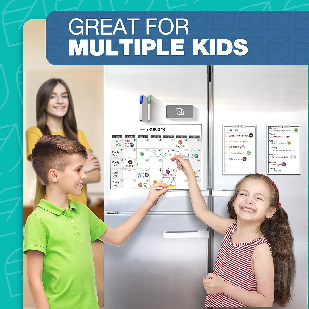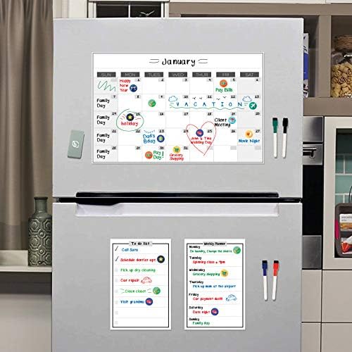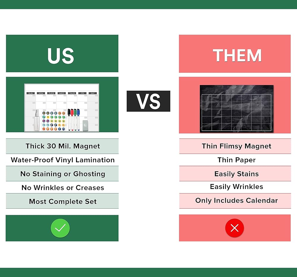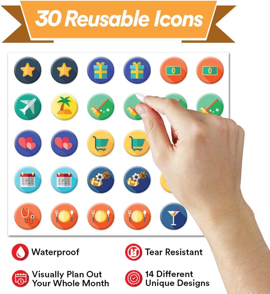متجر واحد - تتضمن مجموعة التقويم الخاصة بنا (4) أقلام تحديد وأيقونات قابلة لإعادة الاستخدام وممحاة وزجاجة رش. في حين أن التقويمات الأخرى تلطخ بسهولة و/أو تتمزق و/أو تصل تالفة. التقويم الخاص بنا مغطى بطبقة رقيقة سميكة وجافة ويتم شحنه بشكل صحيح في صندوق الحماية الخاص به.