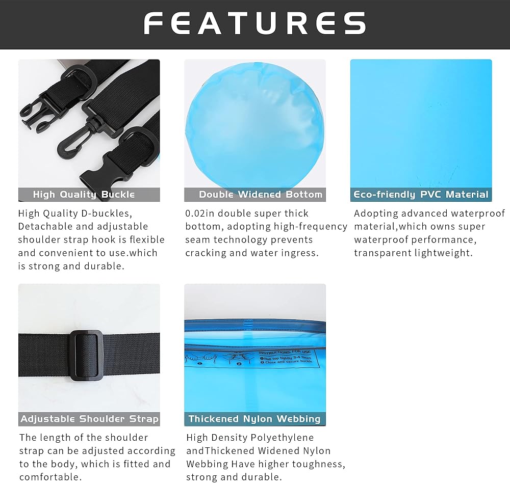 【شفافة وخفيفة الوزن】: مصنوعة من مادة PVC الشفافة المقاومة للاهتراء للعثور بسهولة على المكان الذي توجد فيه أغراضك دون الحاجة إلى البحث في الحقيبة الجافة. خفيفة كالريشة ومدمجة. الحقيبة المثالية للماء للسفر! يمكن طيها وتعبئتها بإحكام مما يجعلها واحدة من أفضل الحقائب المقاومة للماء للسفر.