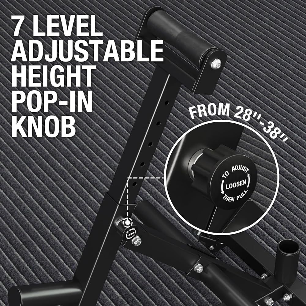 [قابلية تعديل الارتفاع متعددة الاستخدامات] مع 7 خيارات قابلة لضبط الارتفاع ومقبض زنبركي سهل الاستخدام، يمكنك تخصيص ارتفاع حامل ضغط الفايكنج بسهولة ليتوافق مع تفضيلات التمرين ونوع الجسم، مما يضمن الشكل الأمثل والراحة القصوى.