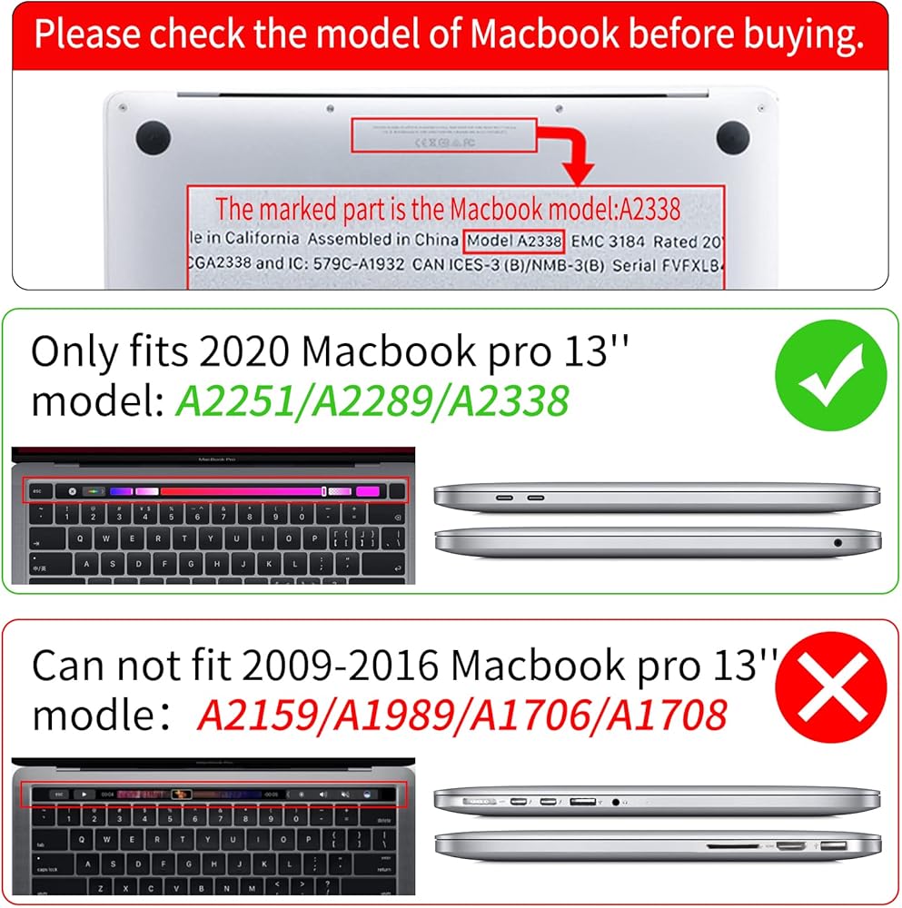 ✔♥التوافق: هذا الجراب متوافق فقط مع جهاز Macbook Pro مقاس 13 بوصة إصدار 2020 M1 A2338/A2289/A2251/. يرجى التحقق من رقم الطراز (AXXXX) في الجزء السفلي من جهاز Macbook الخاص بك لتحديد التوافق والرجوع إلى الصورة المرفقة معرفة ما إذا كان رقم الطراز متوافقًا مع جهاز Macbook الخاص بك.