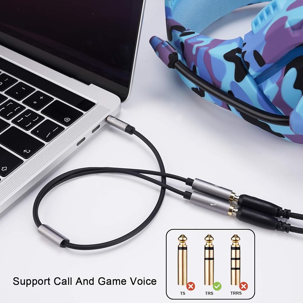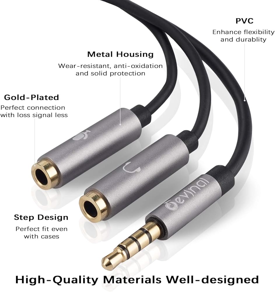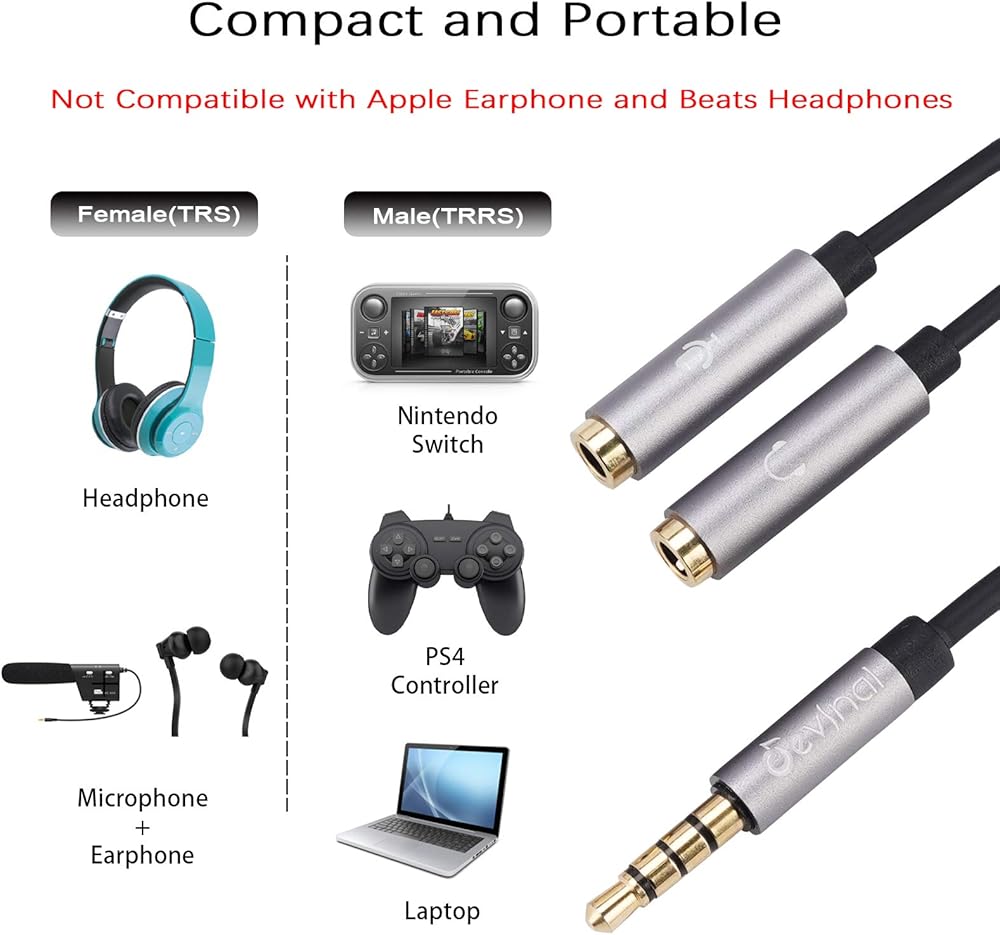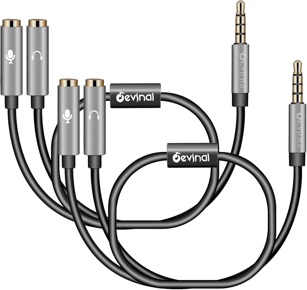 Devinal 3.5 mm headset splitter adapter is used to connect a dual-plug headset to most sevice with a 3.5mm AUX port, such as headset to Xbox adapter, headset to Xbox splitter, headphone to pc adapter.