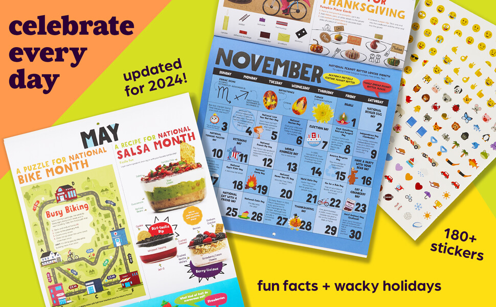 احتفل بالعطلات والذكرى السنوية - قم بتعليق هذا التقويم على الحائط لترى متعة لمدة عام كل يوم؛ يتضمن صفحات شهرية للعطلات واحتفالات الذكرى السنوية التقليدية وغير المعروفة، مثل يوم الجولف المصغر واختراع أول رمز مبتسم