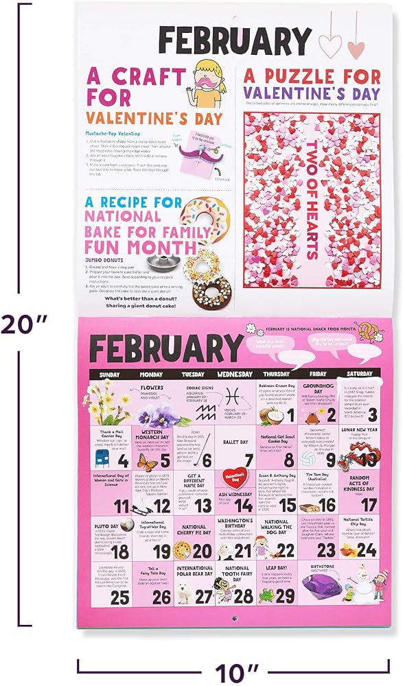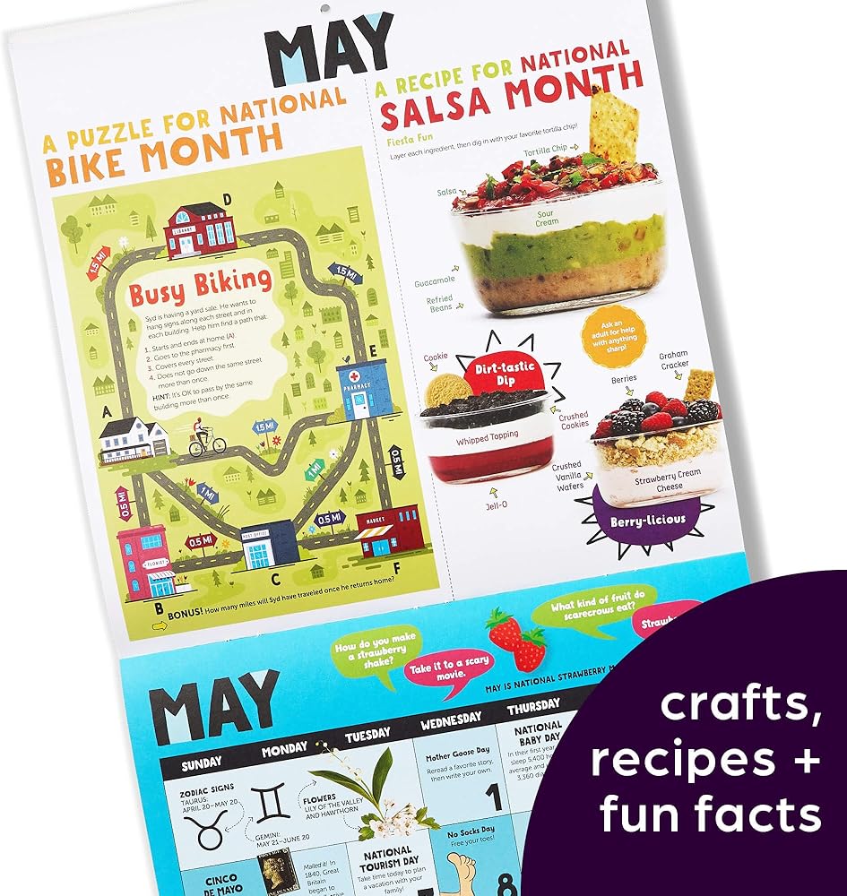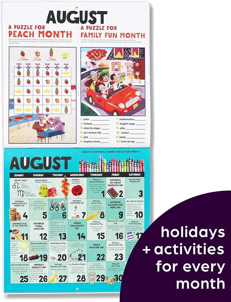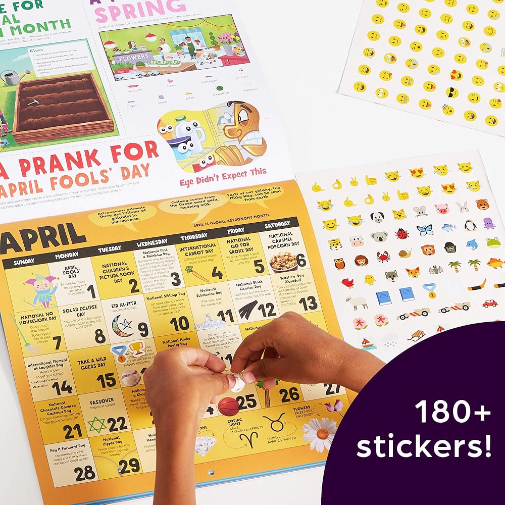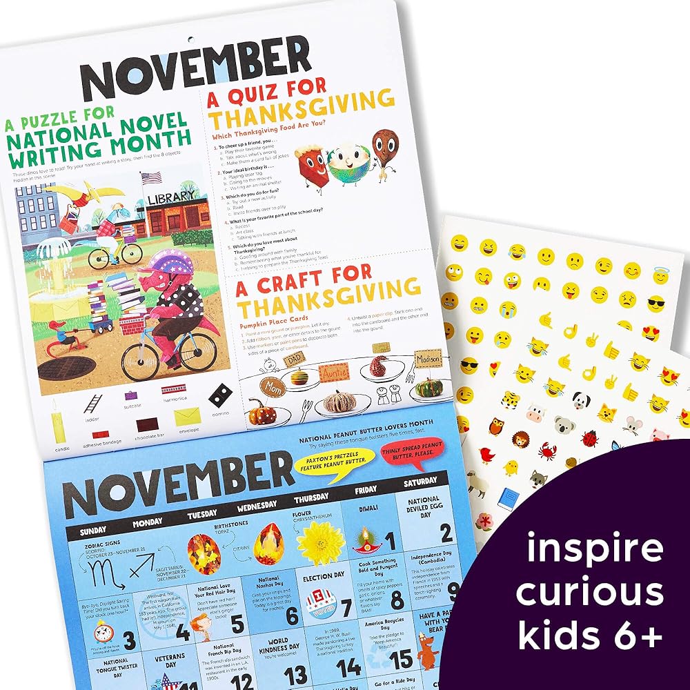 ألغاز وأنشطة إضافية - هدية يمكن للأطفال الاستمتاع بها طوال العام، يقدم هذا التقويم أشياء مثيرة لجميع أفراد العائلة للقيام بها معًا؛ تقدم صفحة كل شهر أنشطة مثل الوصفات والتجارب العلمية والحرف اليدوية، بالإضافة إلى الألغاز التي يجب حلها والنكات للمشاركة