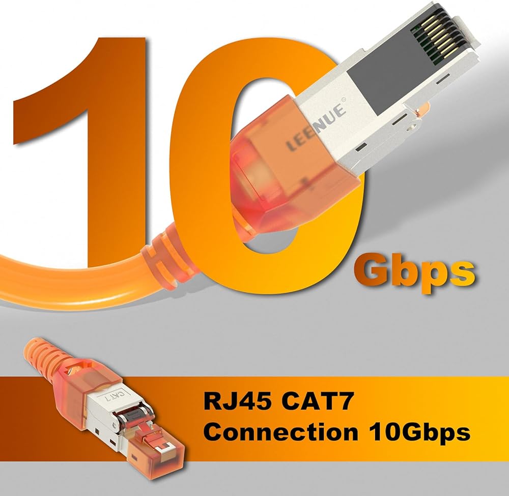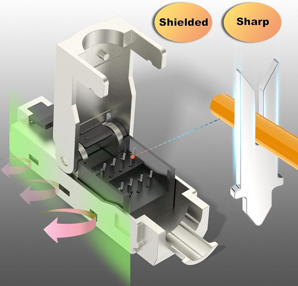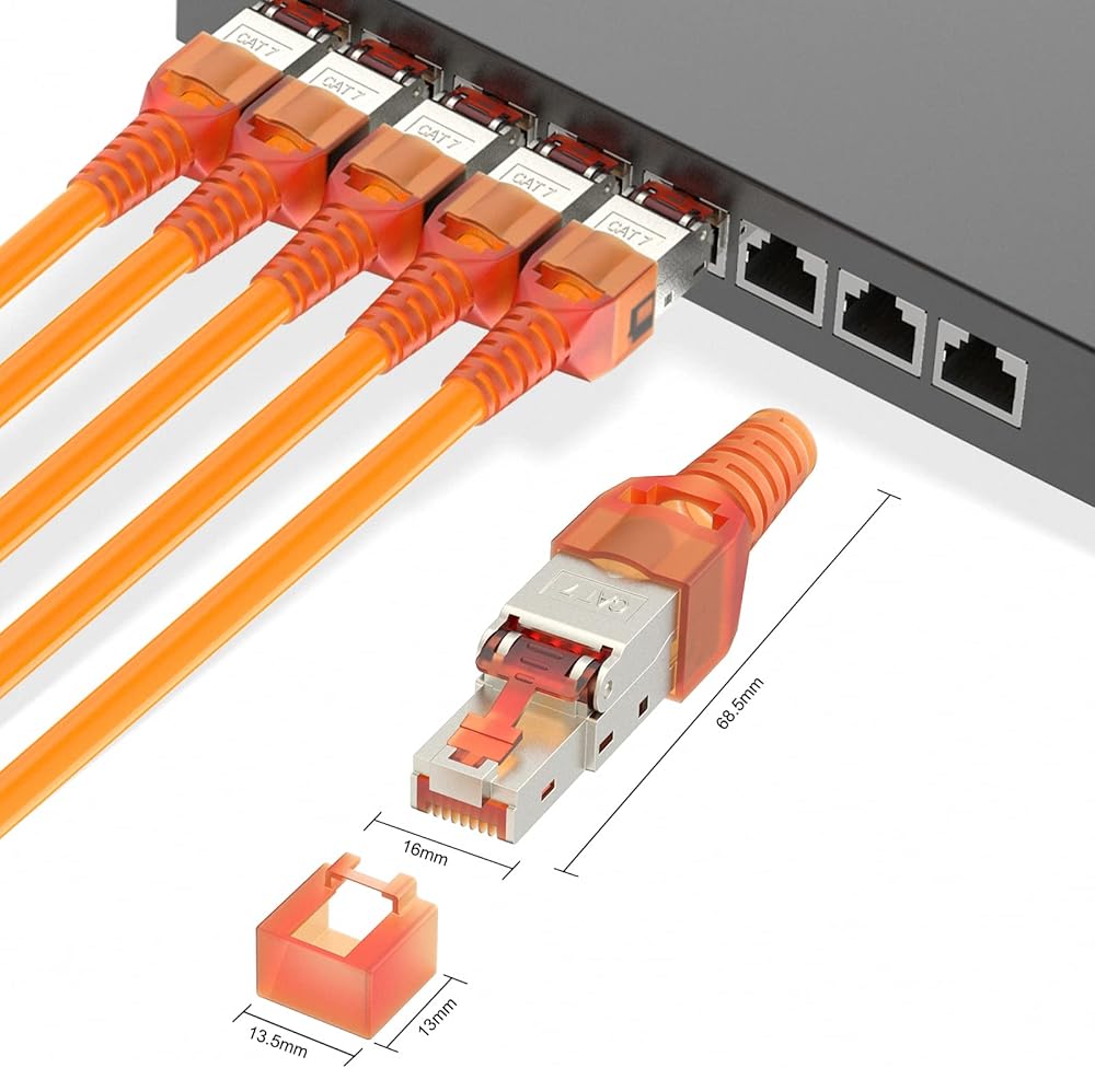 بدون أدوات - تتميز موصلات Cat7 بتصميم بدون أدوات، مما يجعل التجميع سهلاً. يمكنك وضع كابلات الشبكة بسهولة دون استخدام أداة العقص. توجد رموز ألوان واضحة لـ T568A وT568B على الموصلات.