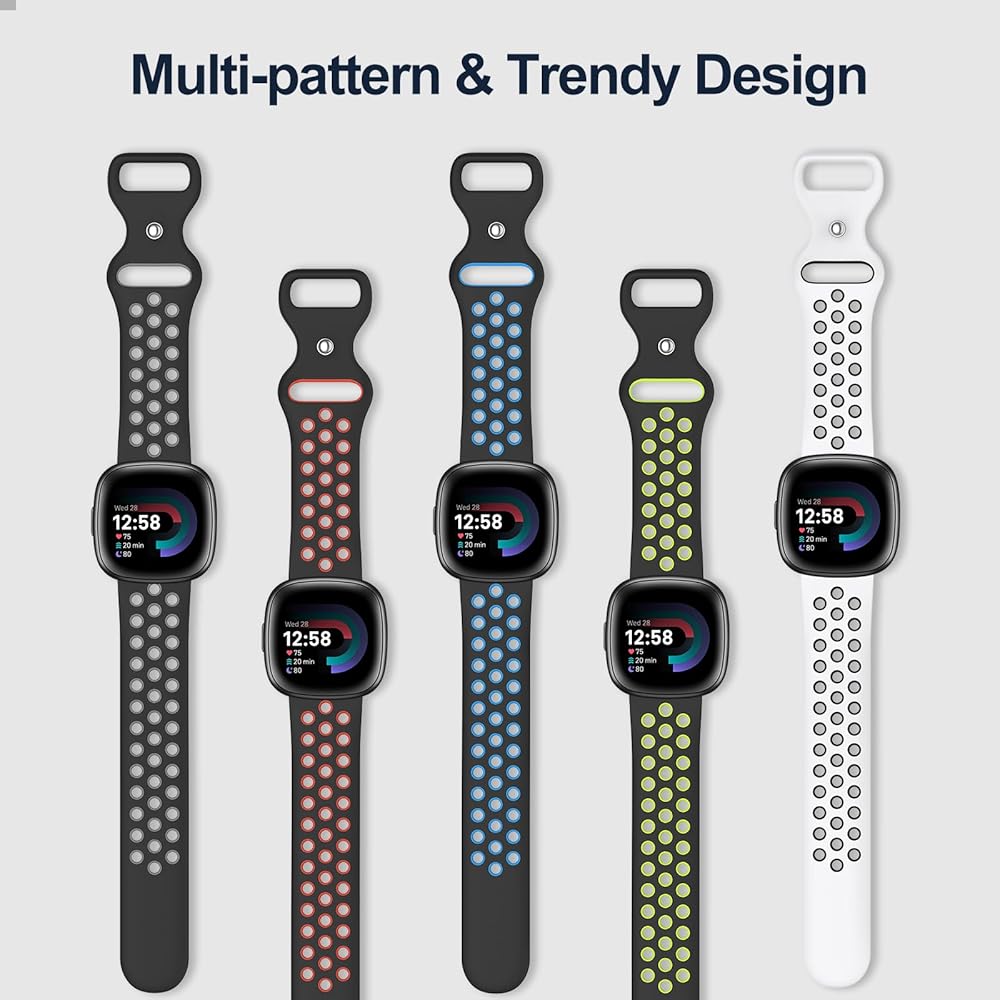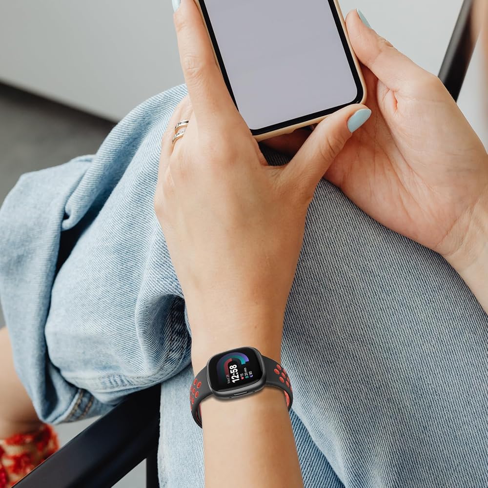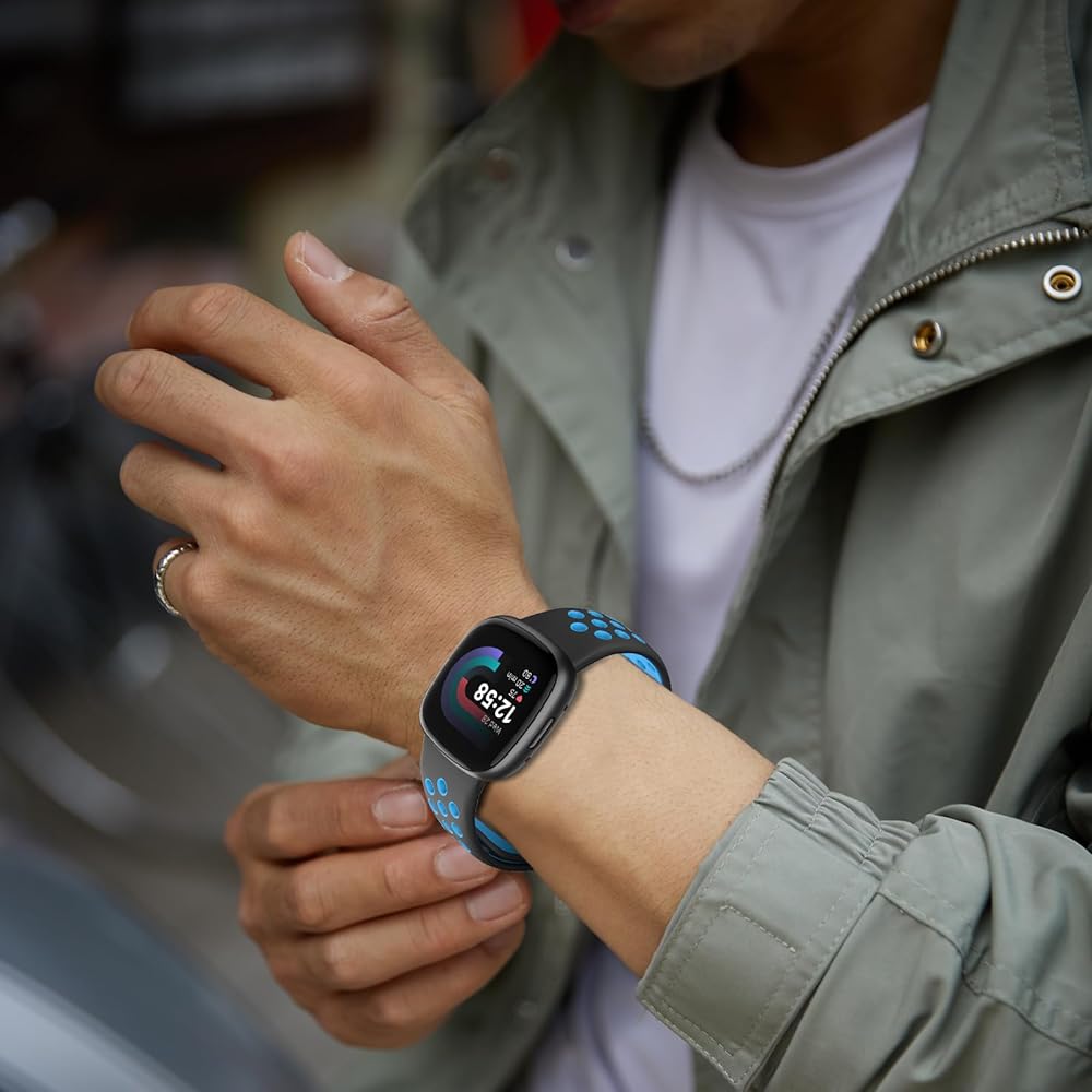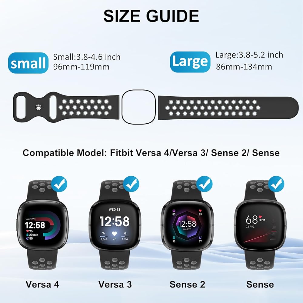 أربطة رياضية مسامية للرجال والنساء: أحزمة السيليكون SKYLET متوافقة مع Fitbit Versa 3/Fitbit Sense/Fitbit Versa 4/Fitbit Sense 2. هناك مقاسان لتختار من بينهما. سوار ساعة كبير الحجم يناسب معصم مقاس 6.9-8.7 بوصة؛ سوار ساعة صغير الحجم يناسب معصم مقاس 6.5-7.9 بوصة. فتحات متعددة لضبط السوار بالمقاس المناسب. يجب عليك شراء حزام ملحق متوافق مع جهاز fitbit Versa 3 الخاص بك للتمرينات.