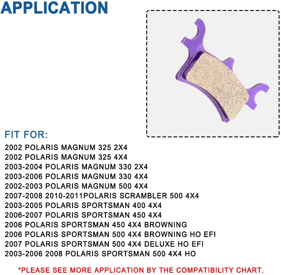 • وسادات فرامل ممتازة لدراجتك النارية أو ATV: وسادات الفرامل مناسبة لـ Magnum 330 2003-200، Scrambler 500 2005-2012، Sportsman 400 2003-2005، Sportsman 450 2006 2007، Sportsman 500 HO 2003-2008، Sportsman 500 X2 2006-2008، رياضي 600 2003-2005، رياضي 700 2002-2007، رياضي 800 2005-2009، تريل بليزر 250 2005 2006، تريل بليزر 330 2008-2013، تريل بوس 330 2005-2013.