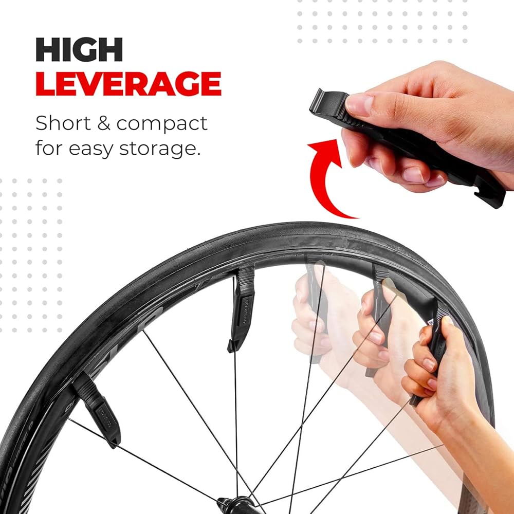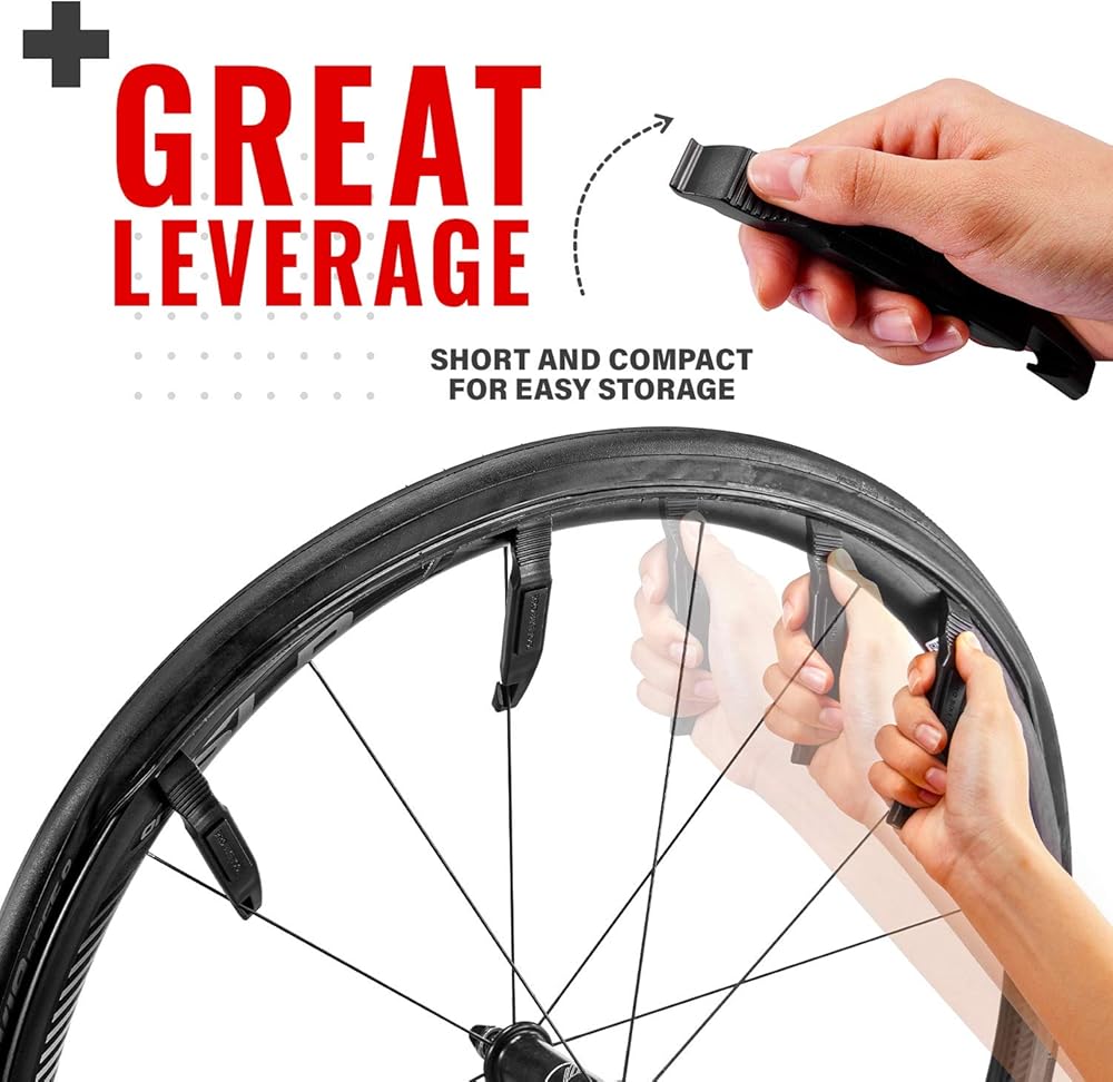 رافعة مالية كبيرة - رافعات طويلة لتحقيق قوة دفع كبيرة مع الإطارات العنيدة، ولكنها قصيرة وصغيرة الحجم بما يكفي لتخزينها بسهولة. يتم ربط الرافعات معًا لسهولة التخزين. ملحوظة: غير مناسب لإطارات الدراجات السميكة والثقيلة للغاية مثل إطارات MTB للانحدار - يوصى باستخدام رافعات الإطارات الطويلة شديدة التحمل المصنوعة من المعدن أو ذات قلب معدني لهذا الغرض.
