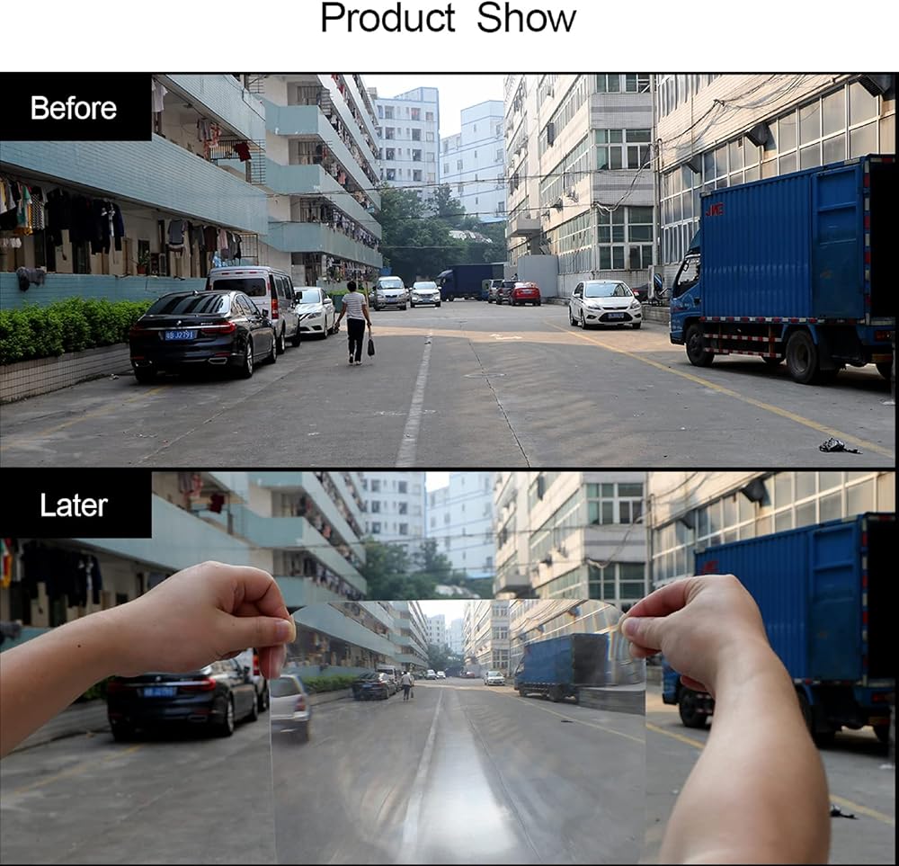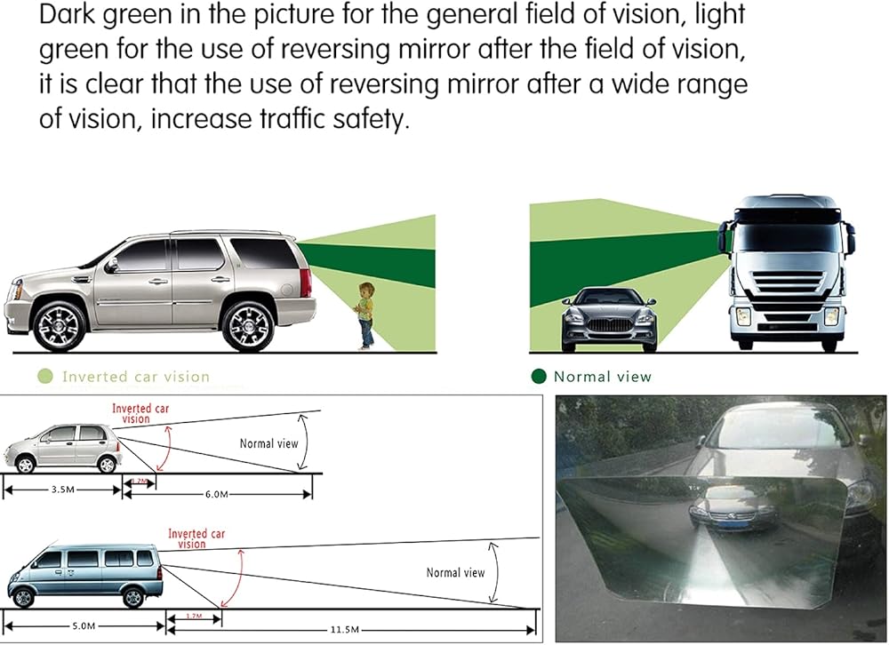 • WIDE ANGLE FRESNEL LENS: Made of flexible PVC, no dazzle and double images. Applies to the inside of your rear window to eliminate rearview blind spots and increase viewing. (Better working for vertical rear windows. )