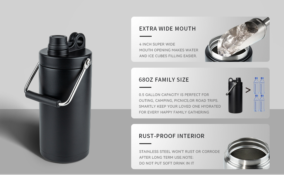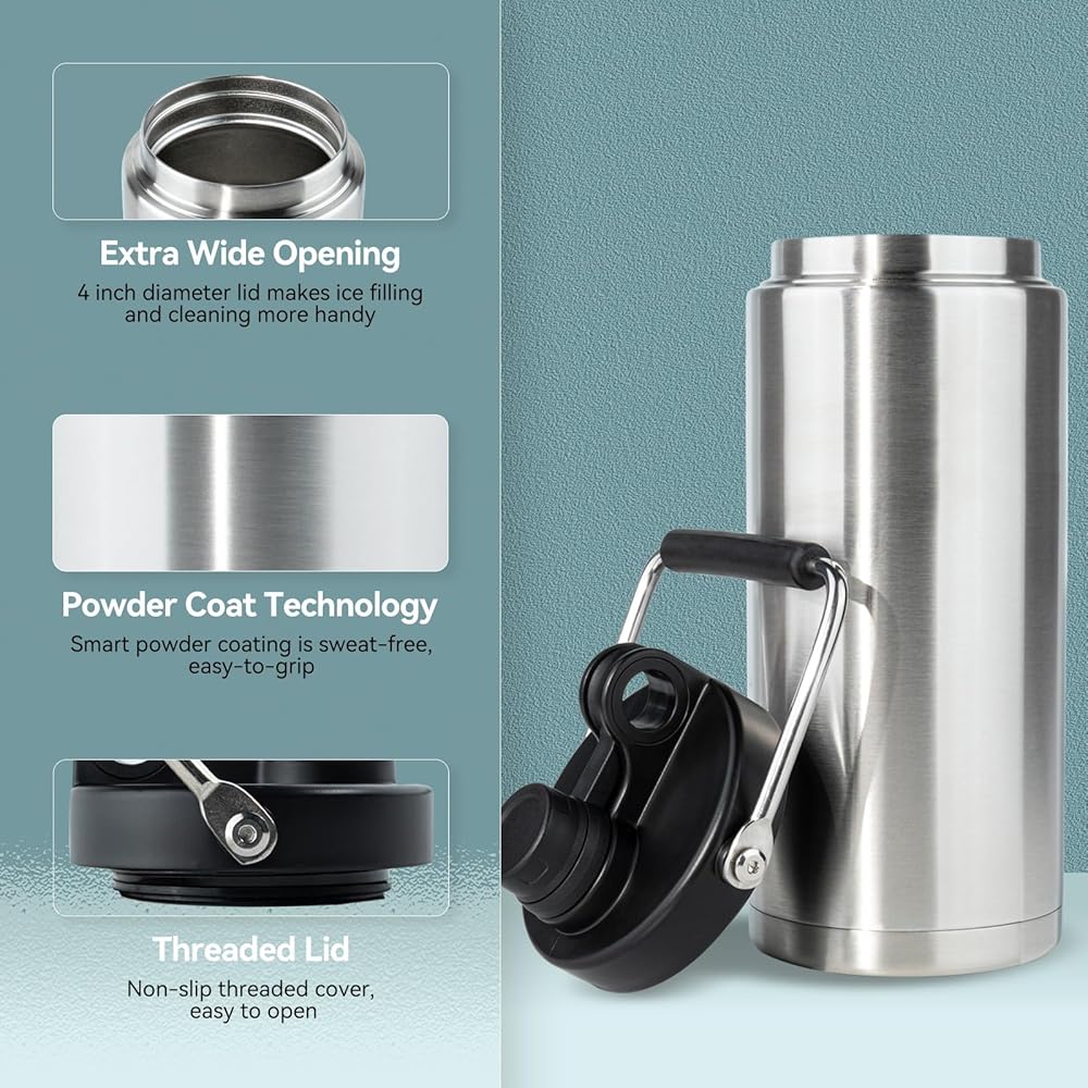 عرض 10.16 سم: يبلغ قطر زجاجة المياه هذه 12.7 سم عرضًا، لذلك فهي أكثر ملاءمة لصب الماء أو الثلج. مقبض من الفولاذ المقاوم للصدأ يجعله أكثر راحة وأمانًا وسهل الحمل. وهذا يجعلها مناسبة للأنشطة الخارجية والتخييم والرياضة وما إلى ذلك.