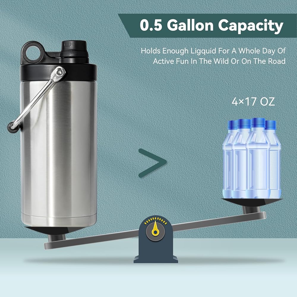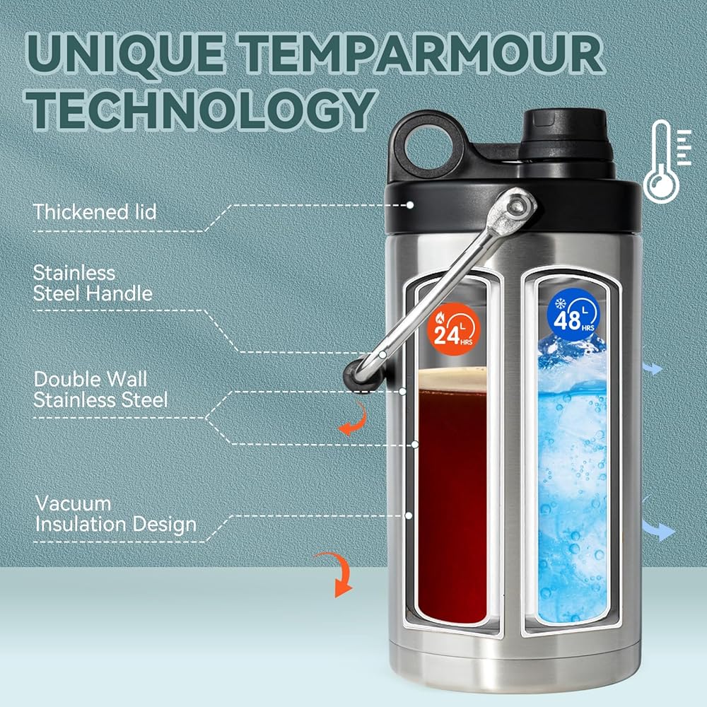 مادة عالية الجودة: زجاجة المياه المعزولة بسعة 64oz مصنوعة من الفولاذ المقاوم للصدأ 18/8 (305)، خالية من البيسفينول A، قابلة لإعادة الاستخدام وخالية من البقايا. يمكن للسوائل أن تحافظ على أفضل مذاقها طازجًا طوال اليوم. ومع ذلك، لا ينصح بسكب المشروبات الغازية والسوائل الأخرى التي قد تلحق الضرر بالجدار الداخلي.