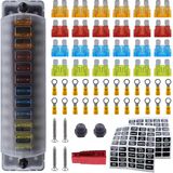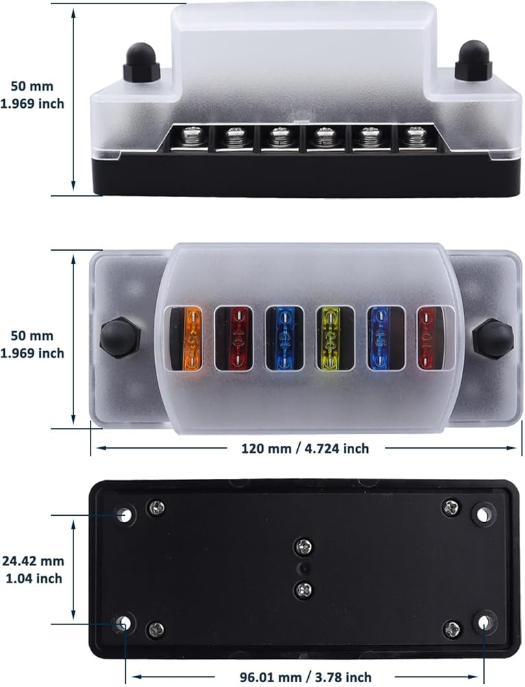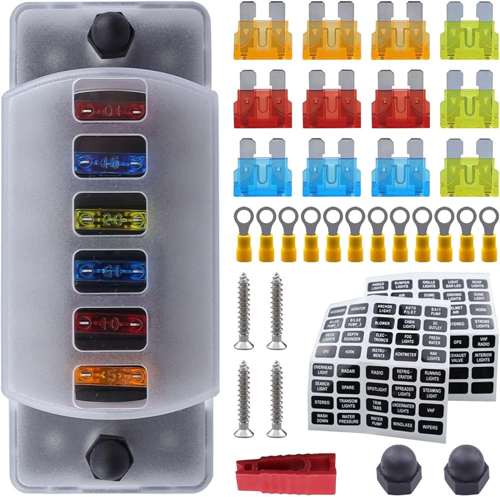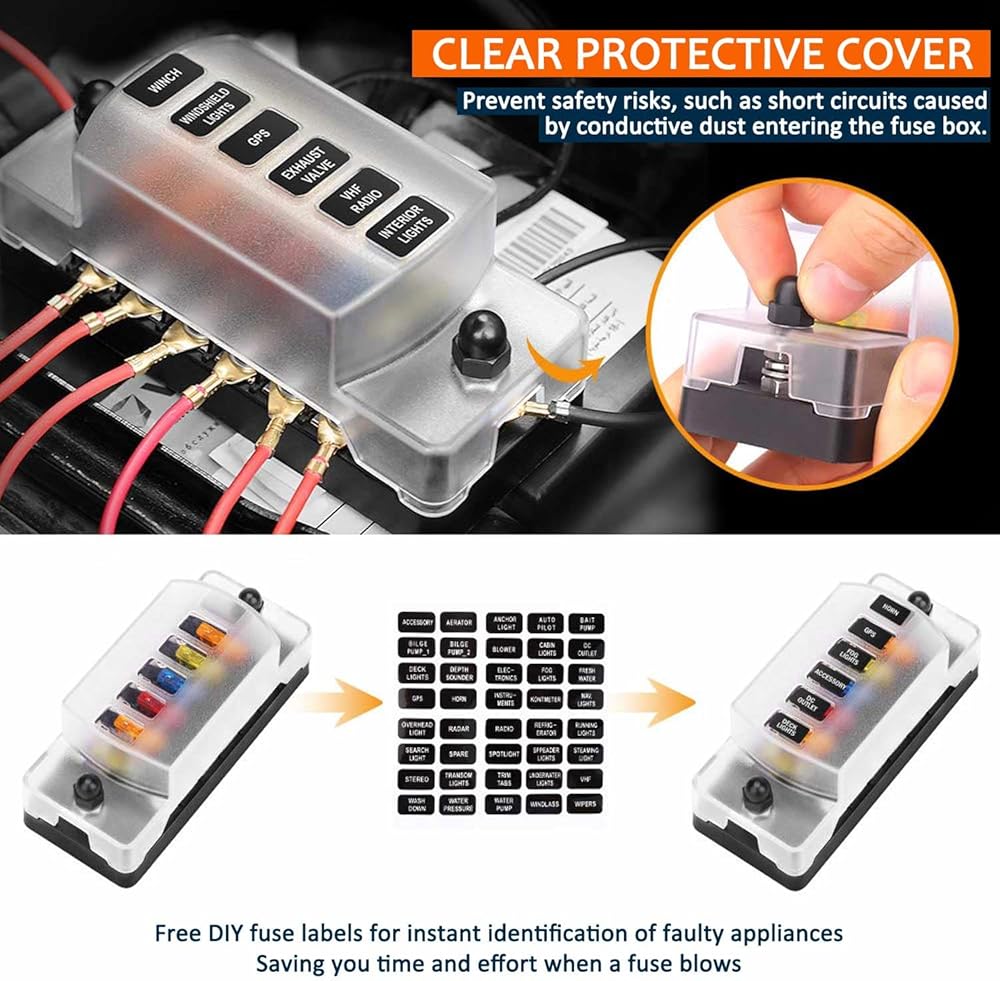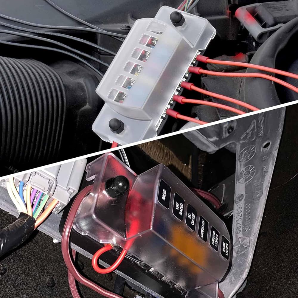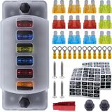 Enhance your vehicle's electrical protection with our 6-circuit Marine and Automotive Fuse Block. Crafted from eco-friendly PBT and PC materials, it guarantees safety, durability, and efficiency. The built-in LED indicators swiftly detect blown fuses, making troubleshooting a breeze. Its compact design simplifies installation in tight spaces, and the package includes essential fuses and labels for easy maintenance. Achieve neat and organized wiring with 6 dedicated fuse slots and grounding positions, catering to cars, RVs, trucks, boats, and yachts.