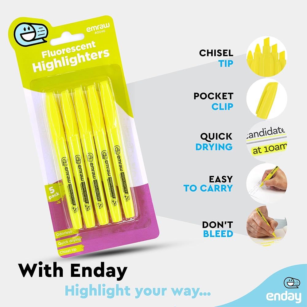 Emraw Highlighters Yellow، مجموعة أقلام تحديد هايلايتر ذات قبضة مريحة، عبوات عالية الأخف على شكل قلم غير سام، قلم تسليط الضوء على طرف فلورسنت خالٍ من التلطيخ للمكتب والمدرسة والمنزل، 5 قطع