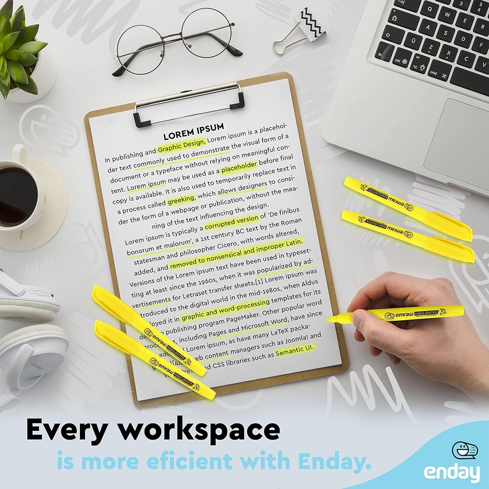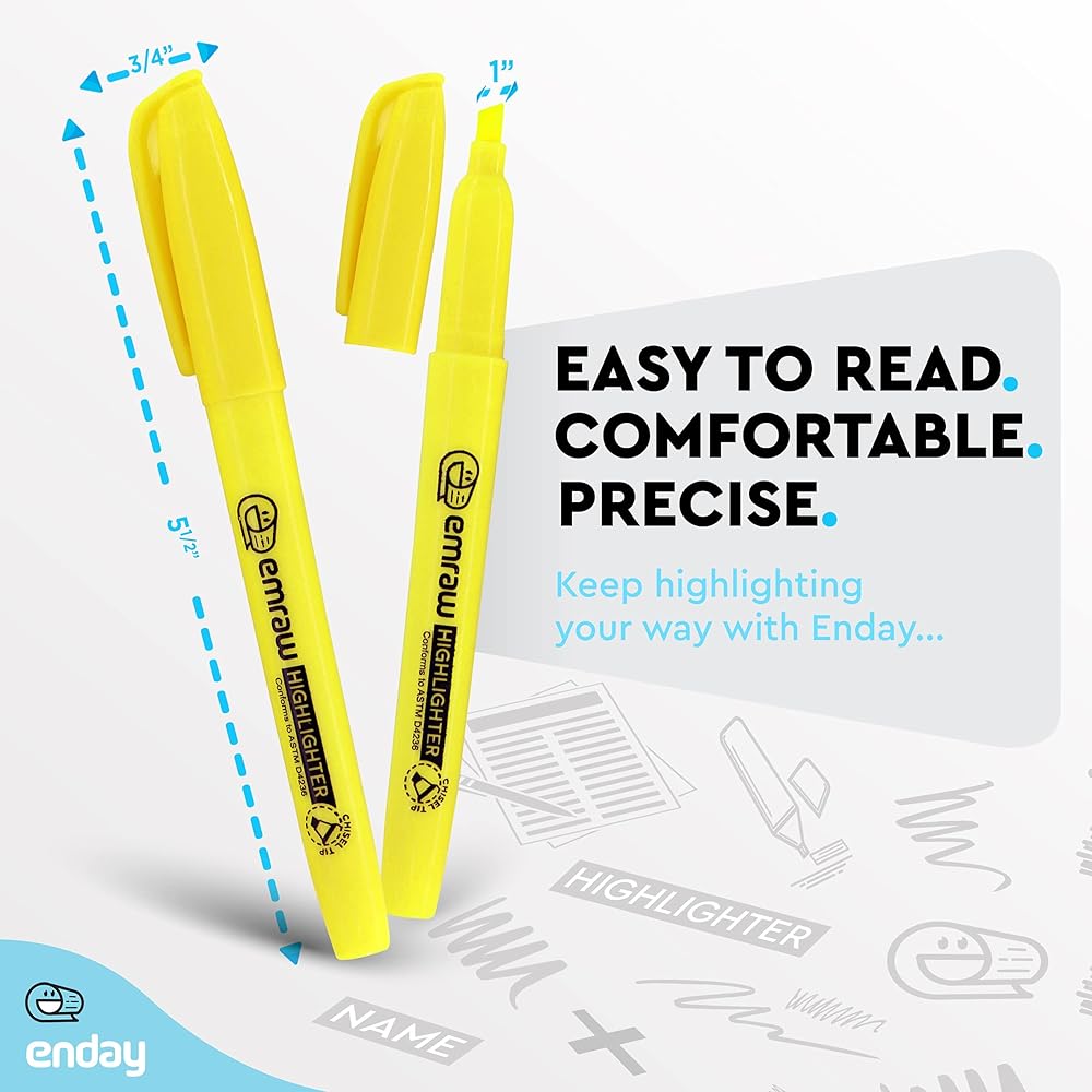 ✔التصميم - يتميز الهايلايتر بطرف إزميل موثوق وضيق ورفيع يخلق خطوطًا سميكة ورقيقة بسهولة. يحافظ طرف الإزميل المتين على شكله للحصول على خطوط نظيفة بشكل موثوق وأداء طويل الأمد. يبرز الطرف المصبوب لأقلام التحديد هذه النص بالحبر الفلوريسنت (الأصفر) النابض بالحياة والملفت للنظر. أقلام التحديد صغيرة بما يكفي لوضعها في الجيب وحملها.