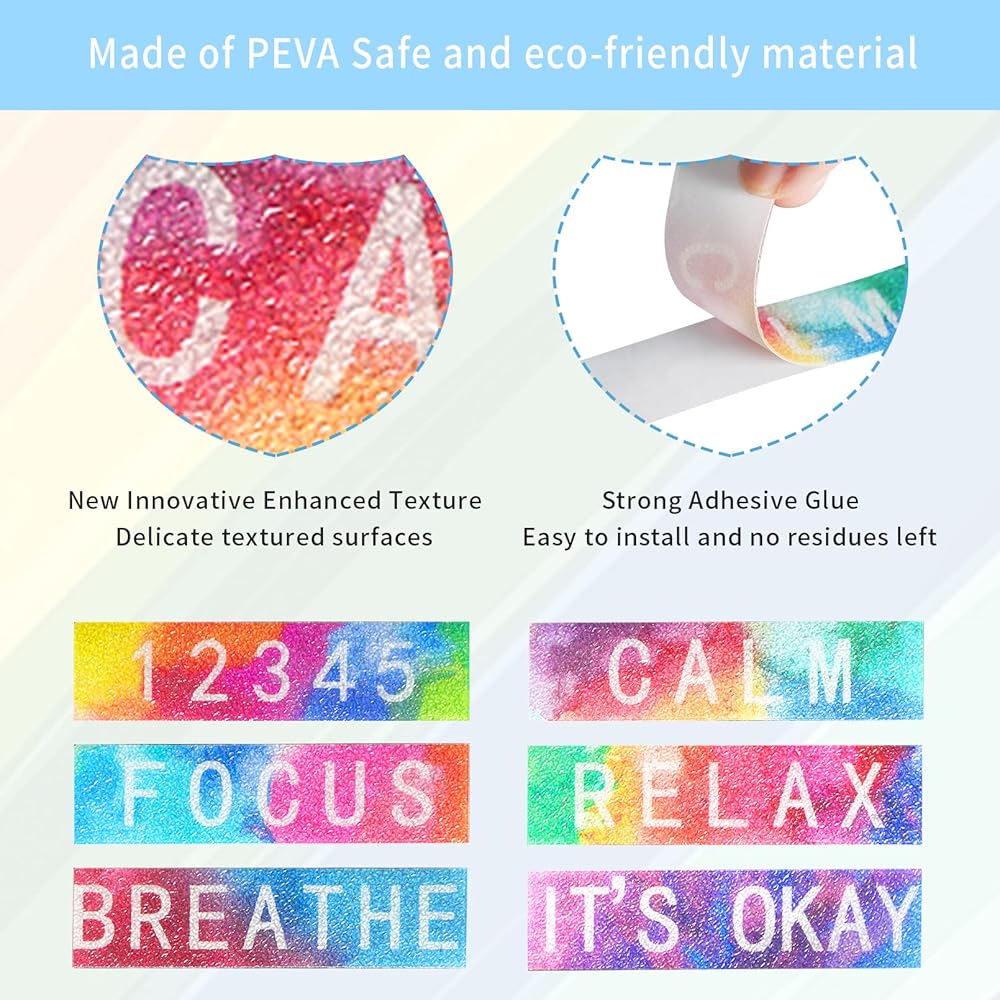 • تخفيف التوتر والقلق: يعتمد الشريط الحسي المضاد للإجهاد على أنماط مهدئة وأنسجة محببة خشنة مفعمة بالحيوية، مما يسمح لك بخدشه وفركه بلطف دون إيذاء أصابعك، ويمكن أن يساعدك على تخفيف التوتر مع تحسين تركيزك أثناء العمل أو الدراسة، أضف استمتع ببعض المرح وقلل من العادات السيئة المزعجة مثل هز ساقيك أو الضغط على أسنانك أو التململ.