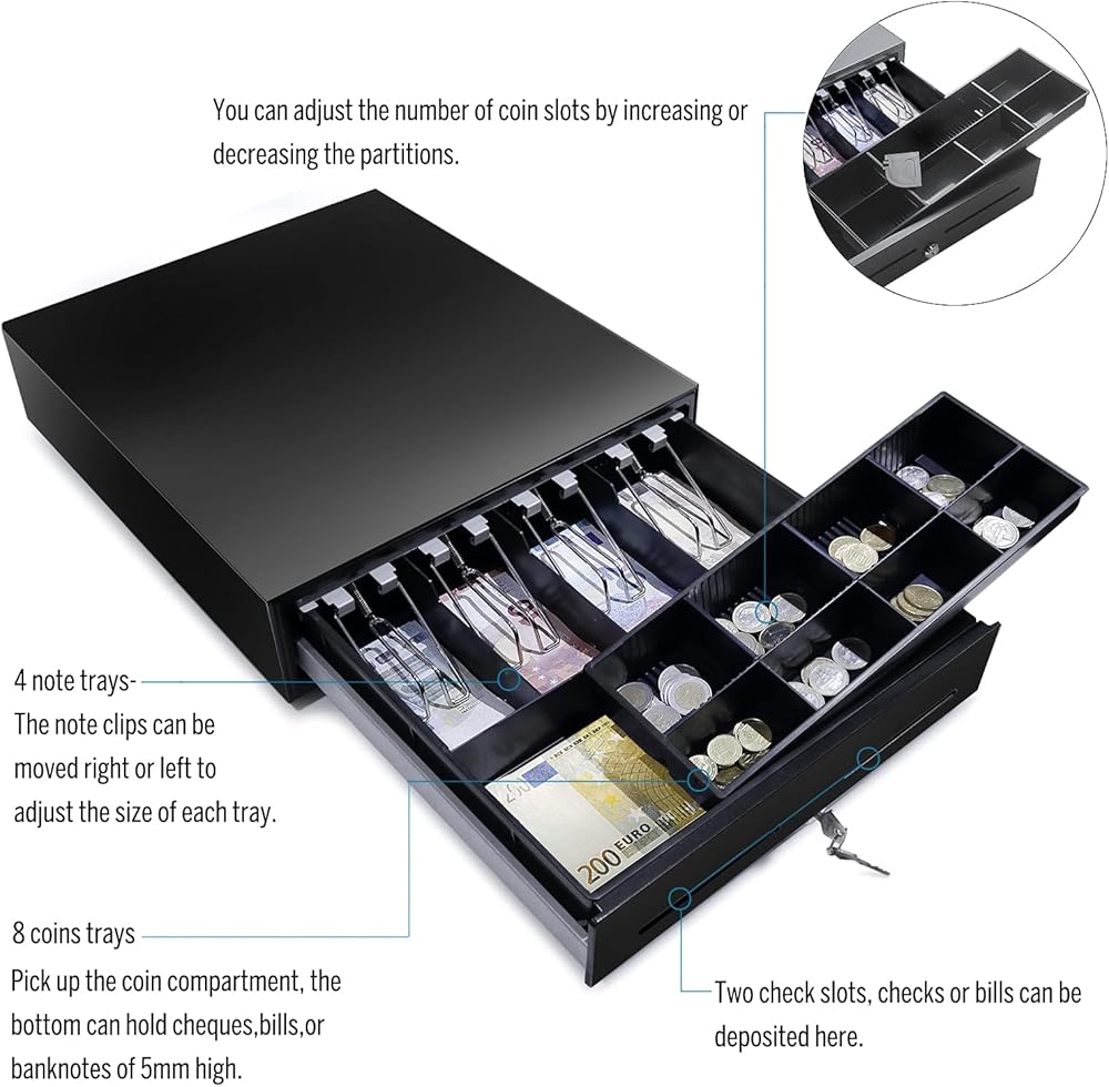 4 Bills & 8 Coins Tray(removable)/ 2 separation slots for storing some extra bigger size receipt/bills