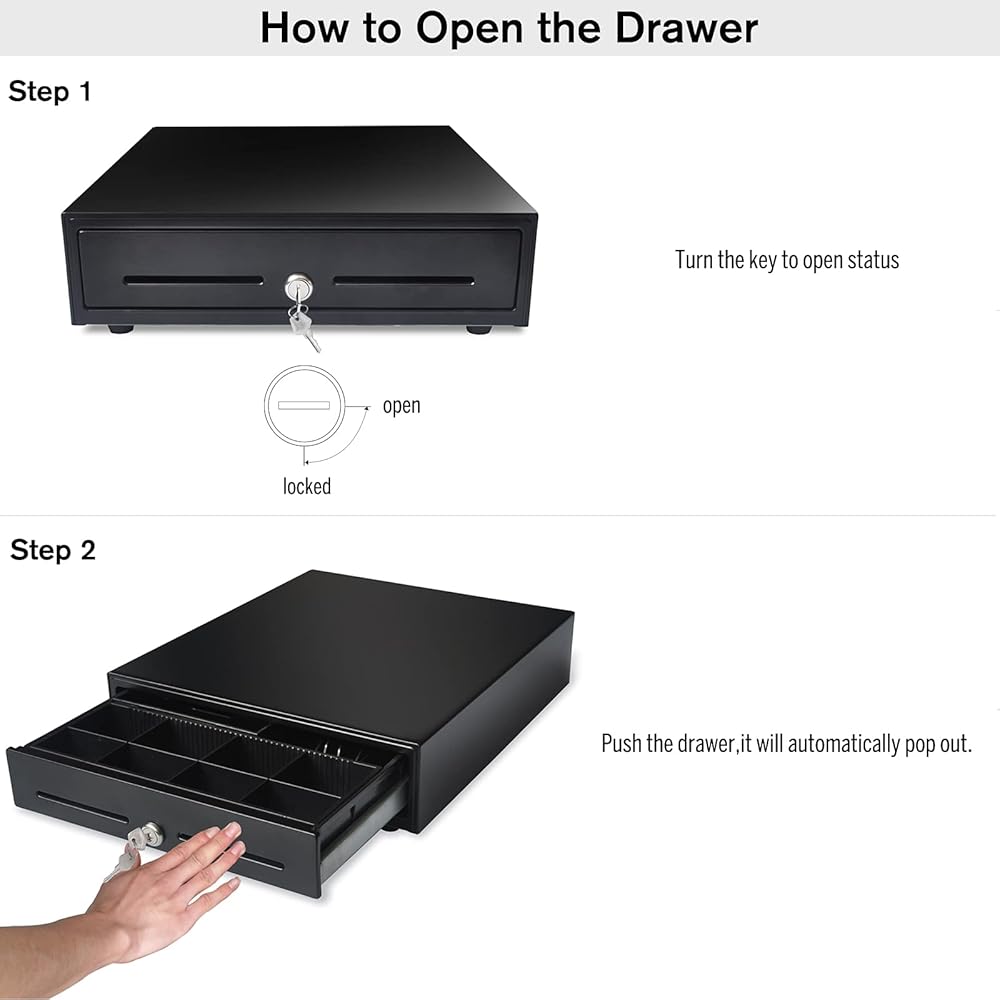 Push to open, no external power or printer needed; / Drawer can't be push open if it is locked by key;