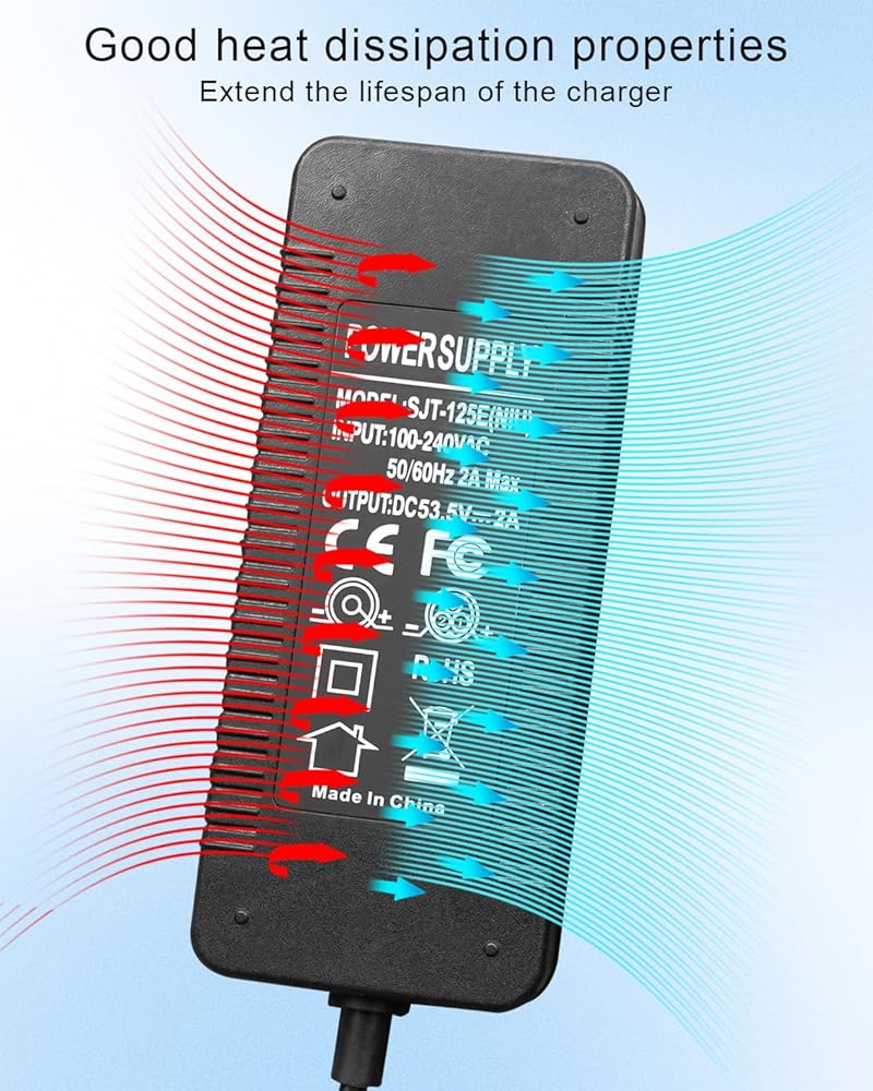 • تبديد الحرارة عالي الجودة: يستخدم الشاحن السريع 53.5 فولت 2 أمبير زعانف سميكة لتبديد الحرارة، والتي يمكنها تبديد الحرارة بكفاءة أثناء عملية الشحن. فهو لا يساعد فقط على إطالة عمر الشاحن، بل يمكنه أيضًا تجربة أداء الشحن الأمثل
