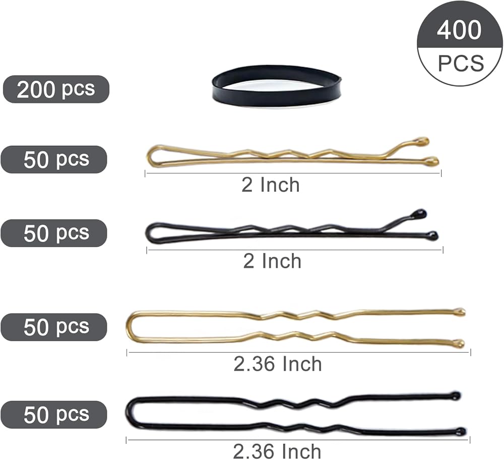 [ما تحصل عليه] صندوق بلاستيكي يحتوي على 50 دبوس شعر أشقر، 50 دبوس شعر أسود، 50 دبوس شعر ذهبي على شكل حرف U، 50 دبوس شعر أسود على شكل حرف U، 100 رباط مطاطي صغير أسود للشعر. (دبوس شعر 1.96 انش، دبابيس شعر على شكل حرف U 2.36 انش، صندوق 6 × 5 × 0.7 انش)