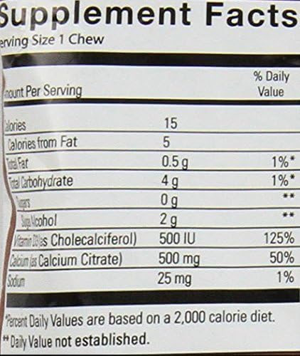 Take less - Get more! Our Calcium Citrate 500 Chewy Bite delivers 500 mg of elemental calcium as calcium citrate in a delicious chew. They also contain a full 500 IU of vitamin D3 for healthy absorption.* These chews are sugar-free and with minimal carbs, so you can get the calcium you need. Each chew is individually wrapped so you can take them with you wherever you go.