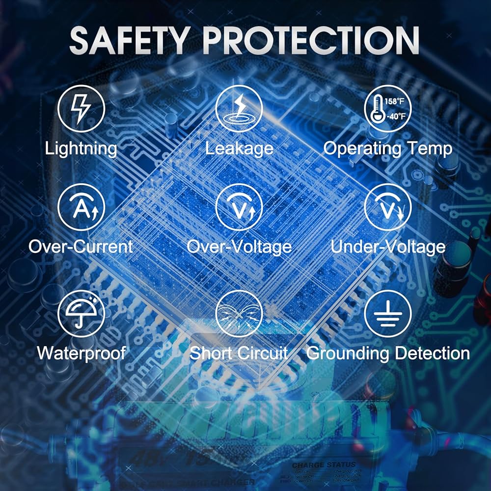 • 【محمول ومريح】: تم تصميم هذا الشاحن مع وضع إمكانية الحمل في الاعتبار، مما يجعل من السهل حمله واستخدامه أينما كنت بحاجة لشحن عربة الجولف الخاصة بك. سواء كنت في المنزل أو خارج الملعب، يمكنك الحفاظ على بطارياتك مشحونة.