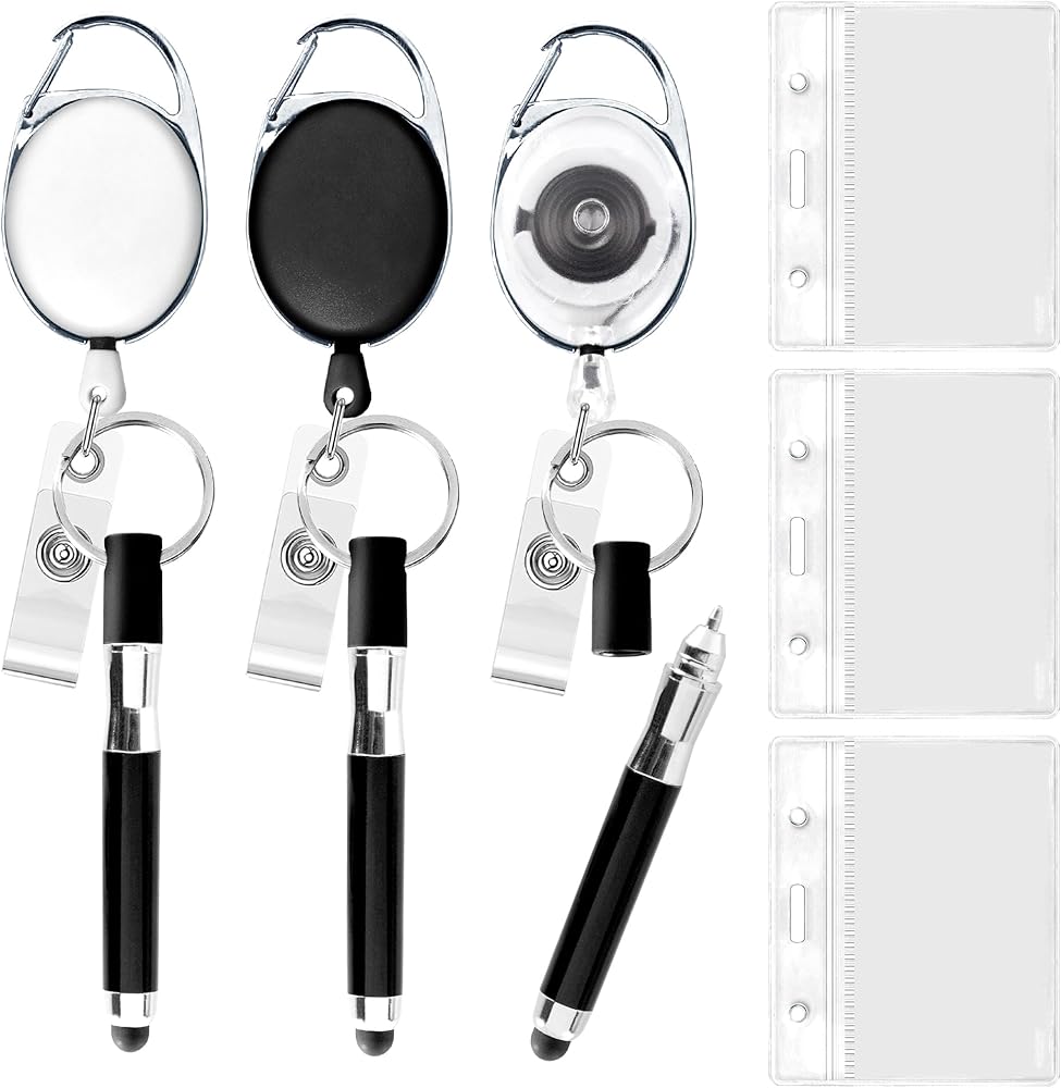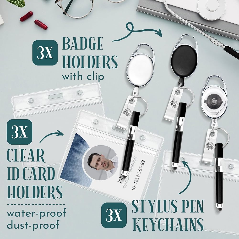 مجموعة مكونة من 3 قطع من بكرة الشارة، وبكرات الشارات القابلة للسحب، تأتي مع 3 أقلام صغيرة و3 حاملات للبطاقات، بالإضافة إلى مشبك التمساح وحبل قابل للسحب، وبكرة شارة الممرضة بثلاثة ألوان.