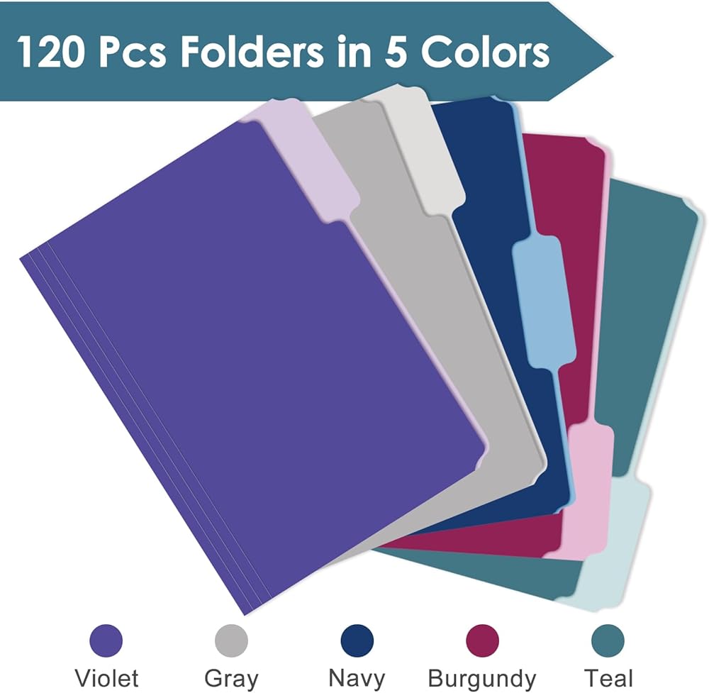 مجموعة مجلدات الملفات Jyusmile - ستحصل على صندوق مكون من 120 حزمة من مجلدات الملفات الملونة المتنوعة التي توفر مساحة تخزين كبيرة. توفر مجلداتنا 3 أوضاع لعلامات التبويب وتناسب المستندات مقاس 8.5 × 11 بوصة، مما يساعدك على تحديد موقع العناصر الخاصة بك وفرزها بسهولة وبشكل أكثر تنظيمًا. مثالية لأي مشروع منزل أو مكتب أو مدرسة!